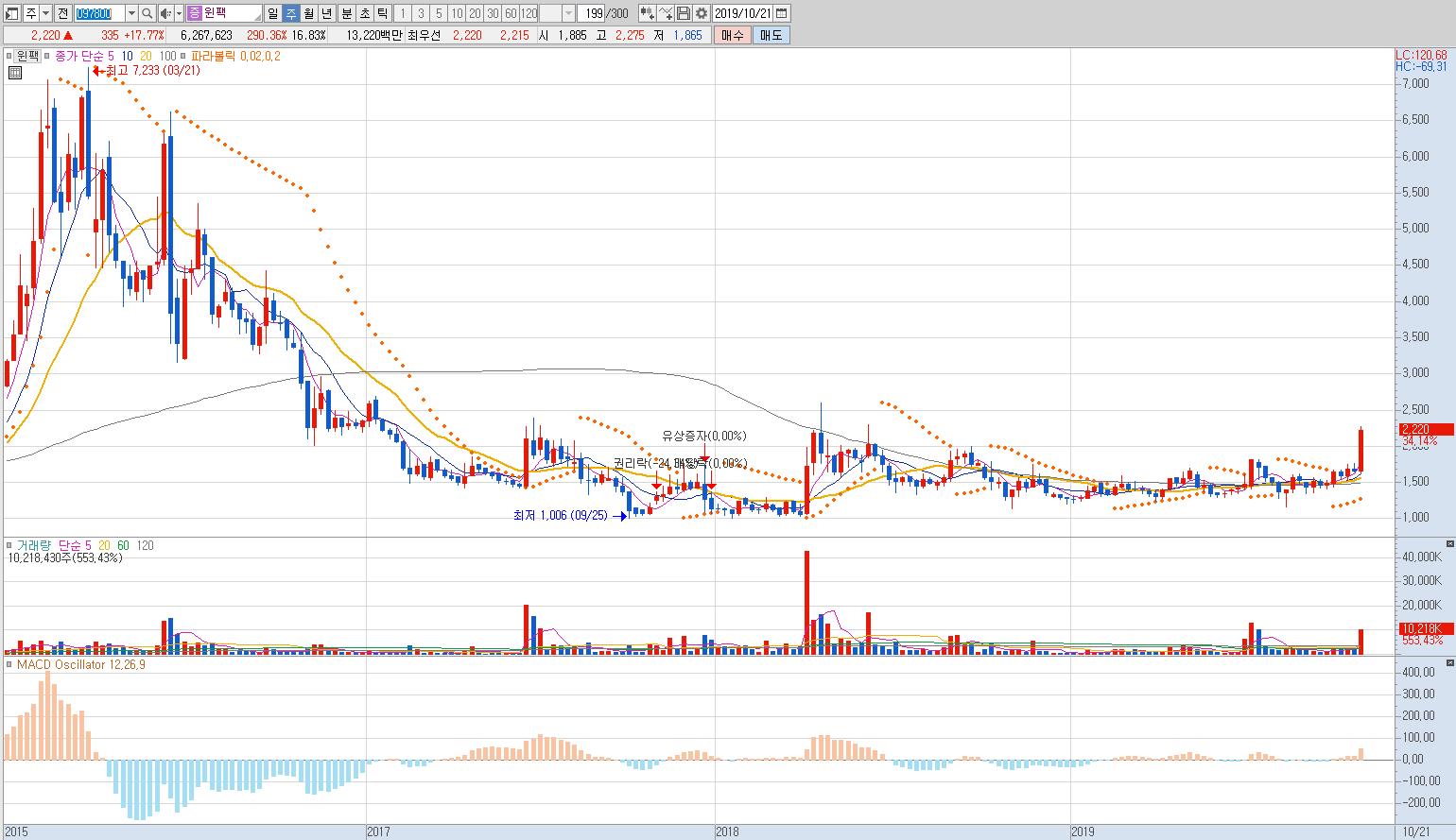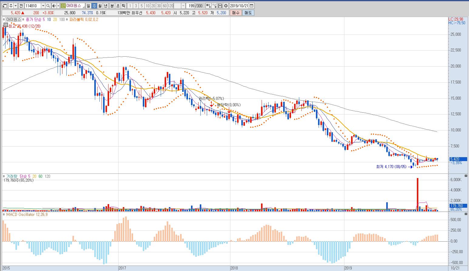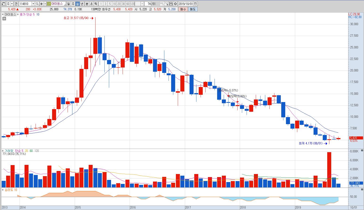 2015년 고점을 찍고 엄청난 하락, 대량거래 발생, 지지선 붕괴, 더 큰 대량거래 발생, 박스권 추세...