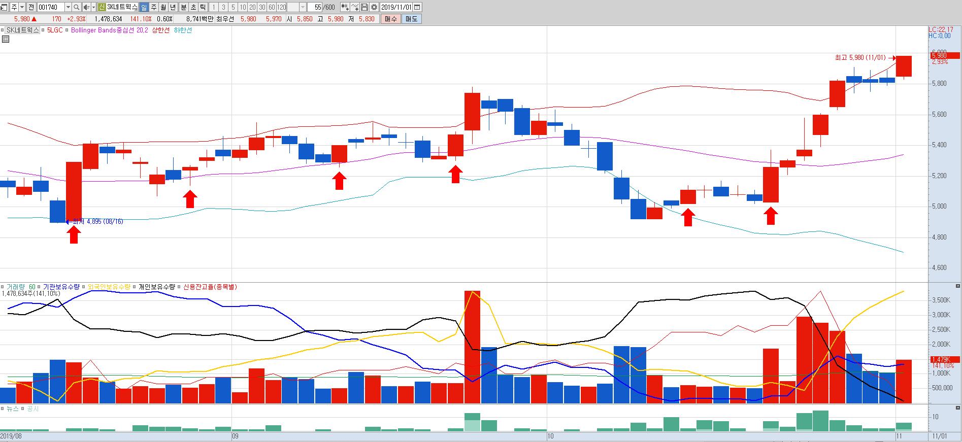SK네트웍스의 경우 4봉전 볼린저밴드 상한선을 돌파하고 난 후 3거래일 거래량을 줄이며 가격대 지지를 해주고 또 볼린저밴드 상한선을 돌파했다.
