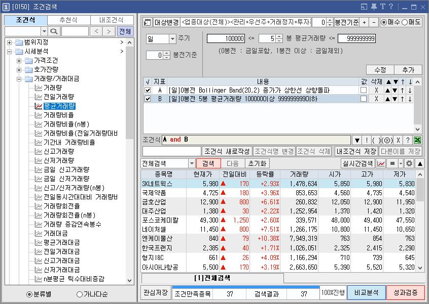 위와 같이 평균 거래량 조건만 더해도 종목 수가 절반 가량 줄어든다.