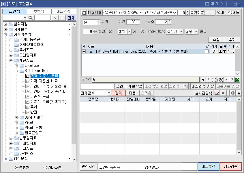이번 포스트에서는 볼린저밴드 상단을 돌파한 종목을 찾는 검색식이다.