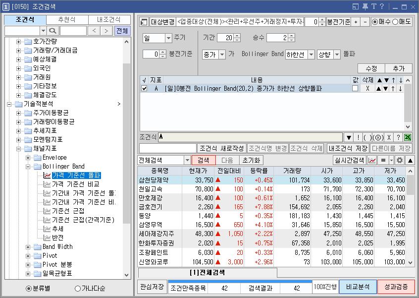 조건검색-대상변경까지 완료한 상태에서 기술적분석-채널지표-볼린저밴드까지 진입.