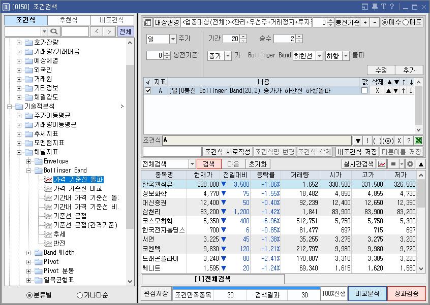이번 검색식 역시 볼린저밴드 하한선을 활용했다.