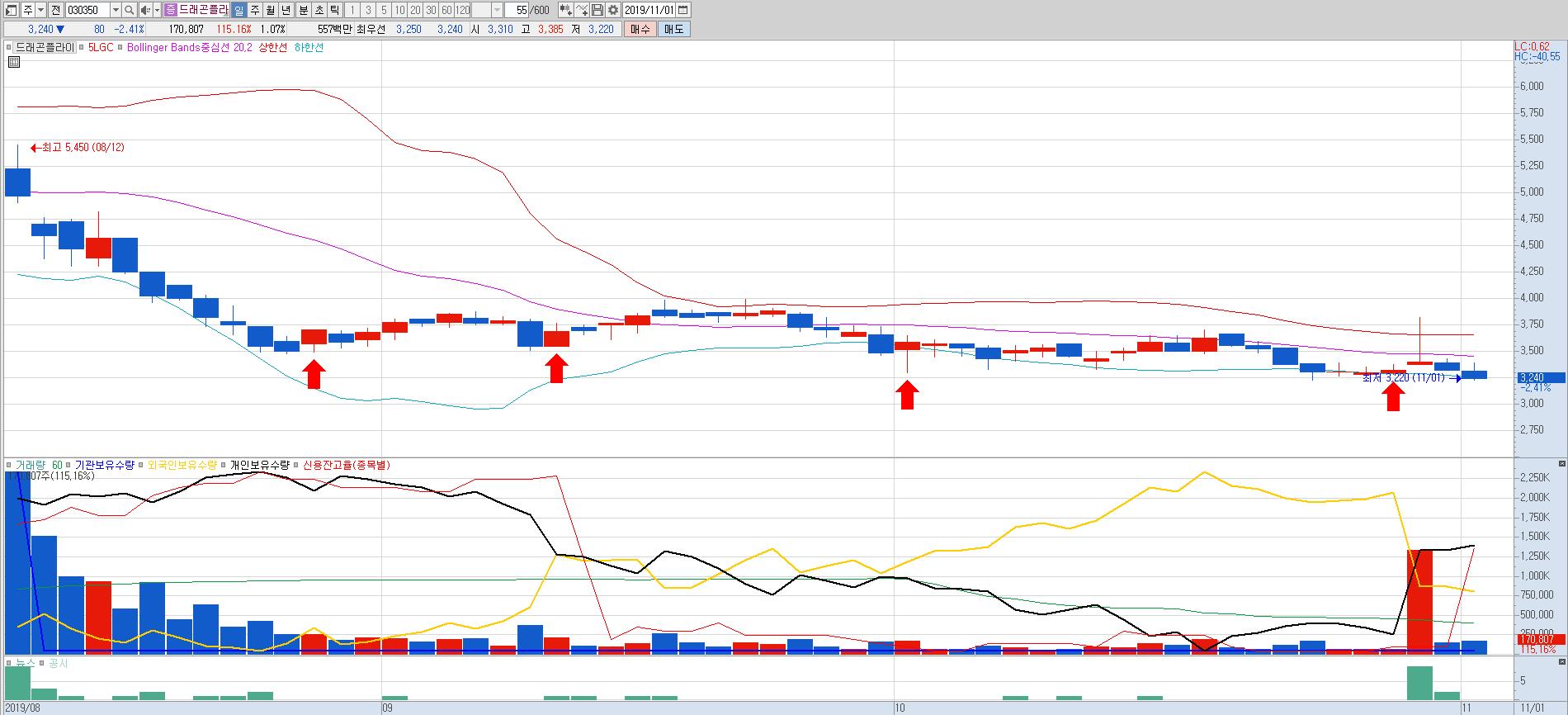 드래곤플라이의 경우도 볼린저밴드 하한선을 이탈하며 최저 가격을 찍었다.