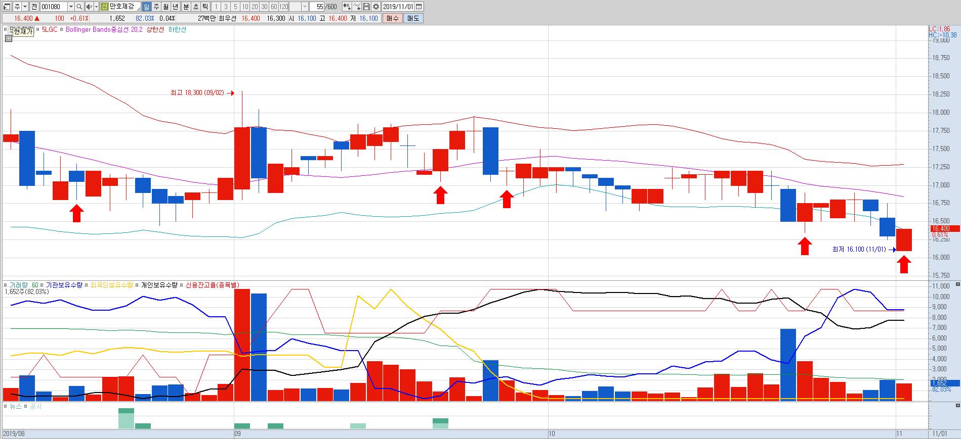 16거래일 전에도 볼린저밴드 하한선을 이탈했다가 다음날 이 가격보다 위로 올라가는 모습을 보여주었다.