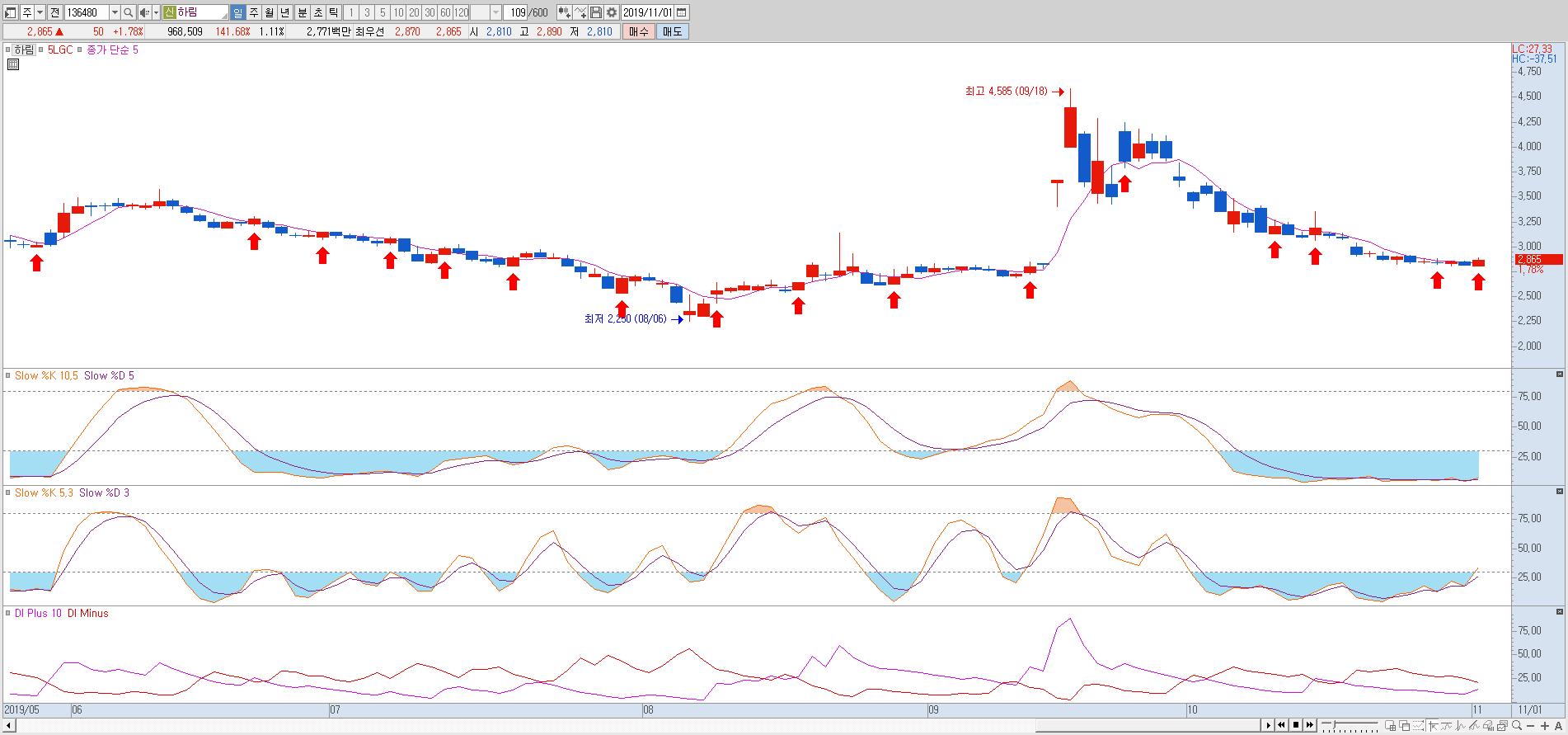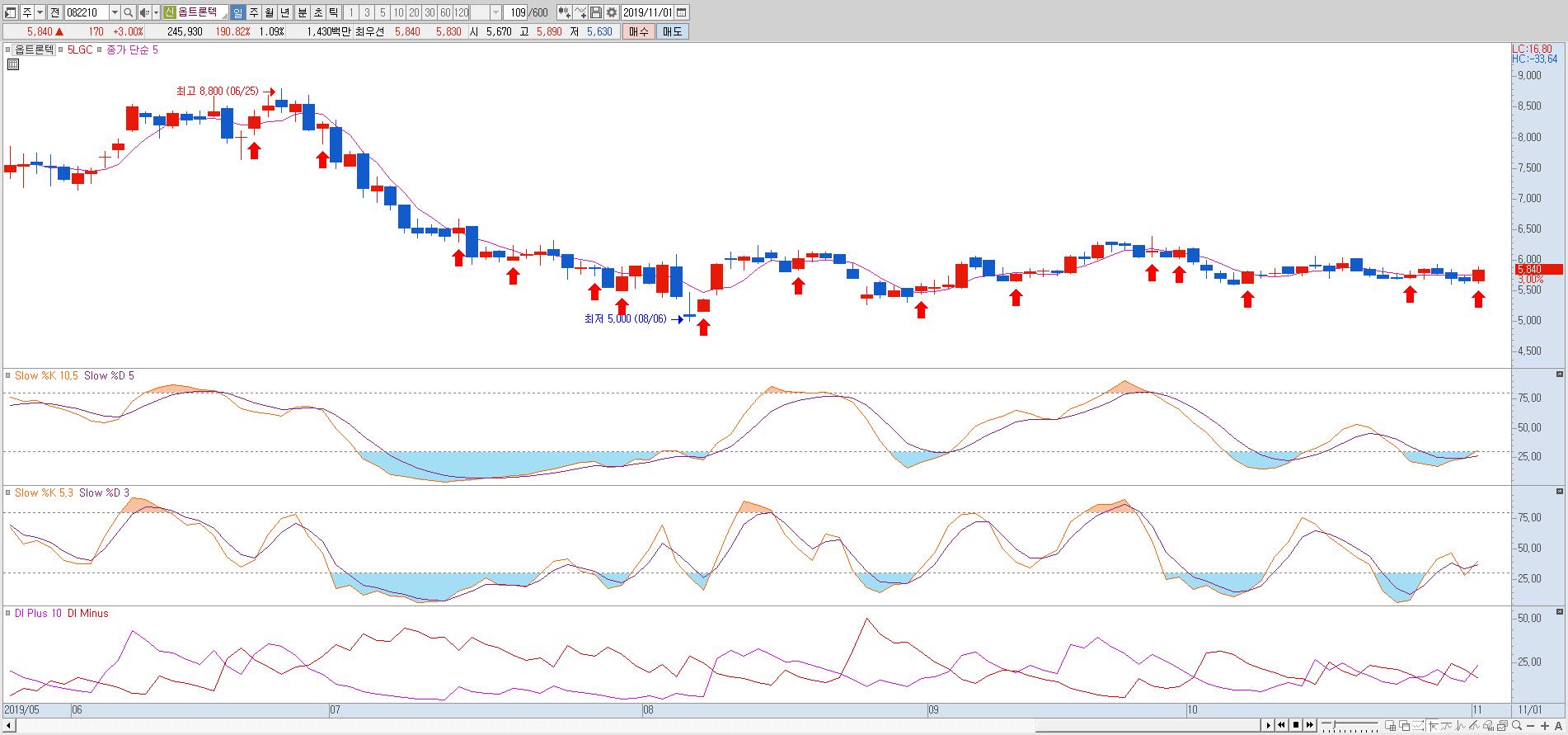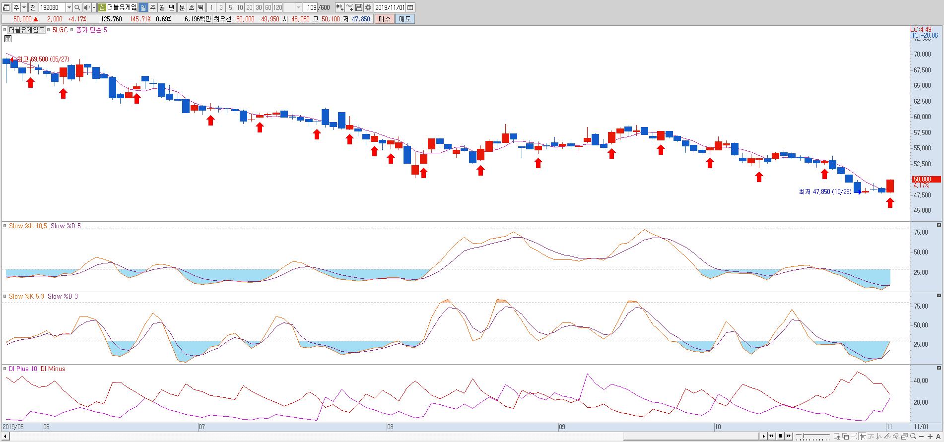 스토캐스틱 슬로우 10/5/5 지표와 5/3/3 지표가 30아래에서 위로 올라오고 있다.