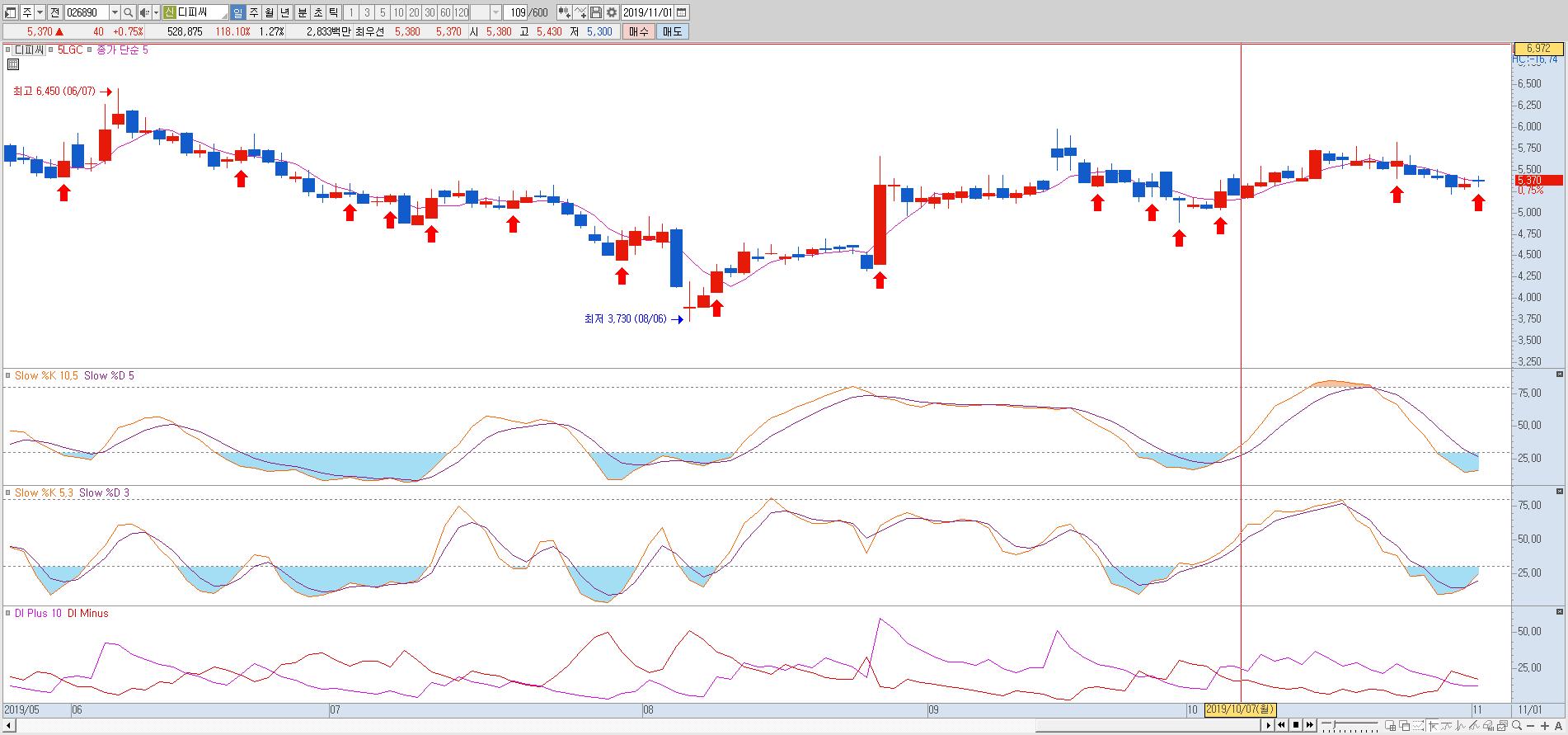 DMI는 크로스되지 않았지만 파란선(DI PLUS10)이 전거래일에 비해 살짝 올라왔다.