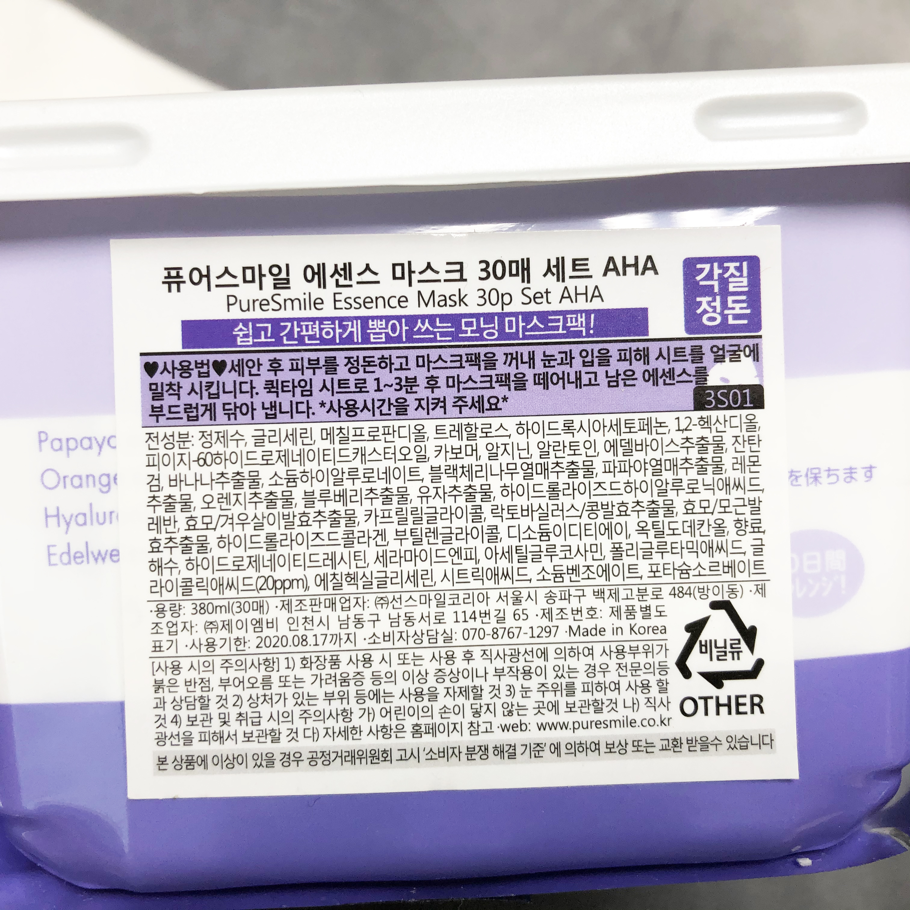 티슈마스크팩 원조! 자랑스러운 우리나라 브랜드 퓨어스마일의 뽑아쓰는 마스크팩의 모습입니다.