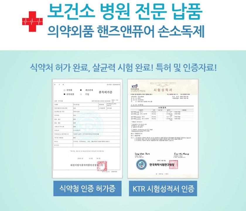 보건소와 병원에 납품되고 있는 휴대용 손세정제 비츄인 핸즈앤퓨어는 식약처 허가와 살균력 시험을 완료한 제품으로 특허와 인증자료를 보유하고 있는 제품으로 살균력을 비롯한 손세정제, 손소독제 기능의 우수성을 입증했습니다.