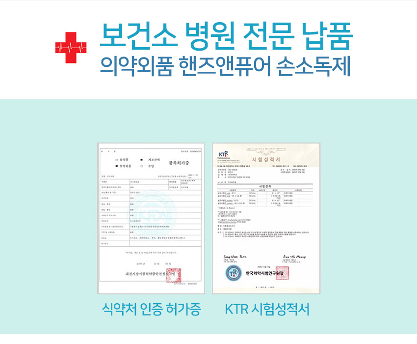 보건소, 병원 등에 전문 납품하고 있으며 식약처 품목 허가증과 시험성적서를 보유하고 있는 등 코로나19 이슈 이전부터 전문적으로 손소독제를 만들어 오던 믿을만한 기업의 제품이구요.