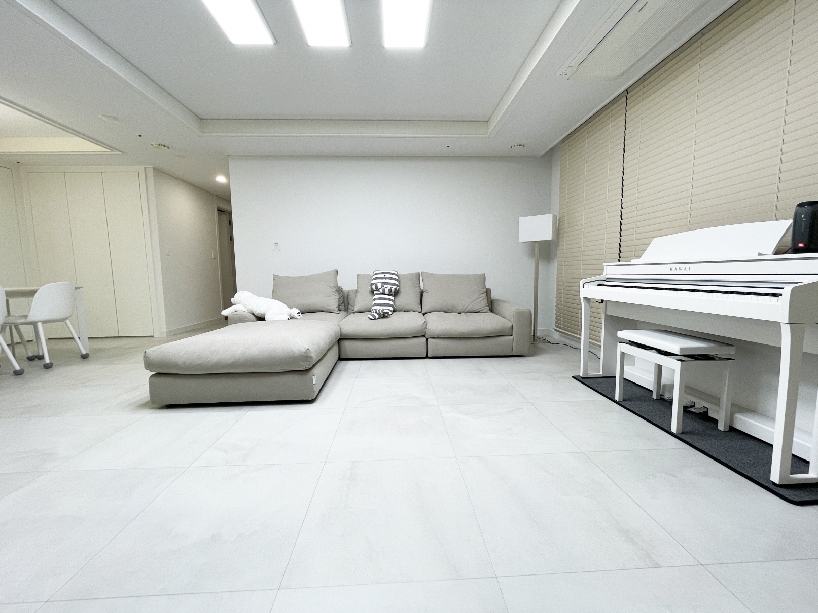 전동식 우드블라인드, 전자피아노, 스툴을 추가한 패브릭 소파, 6인용 식탁을 두었으며 식탁등은 존치하되 구조상 변형을 조금 주었습니다.