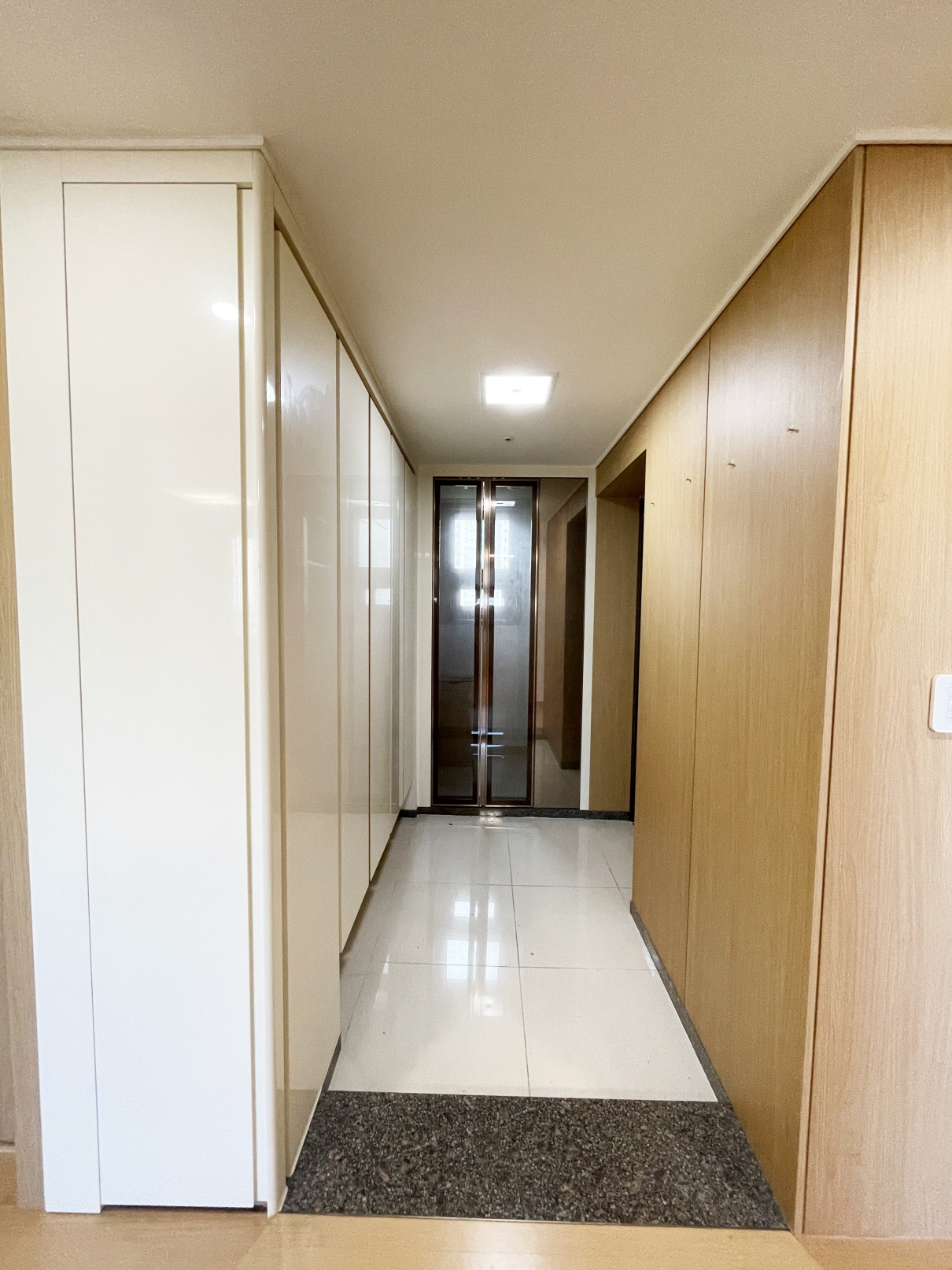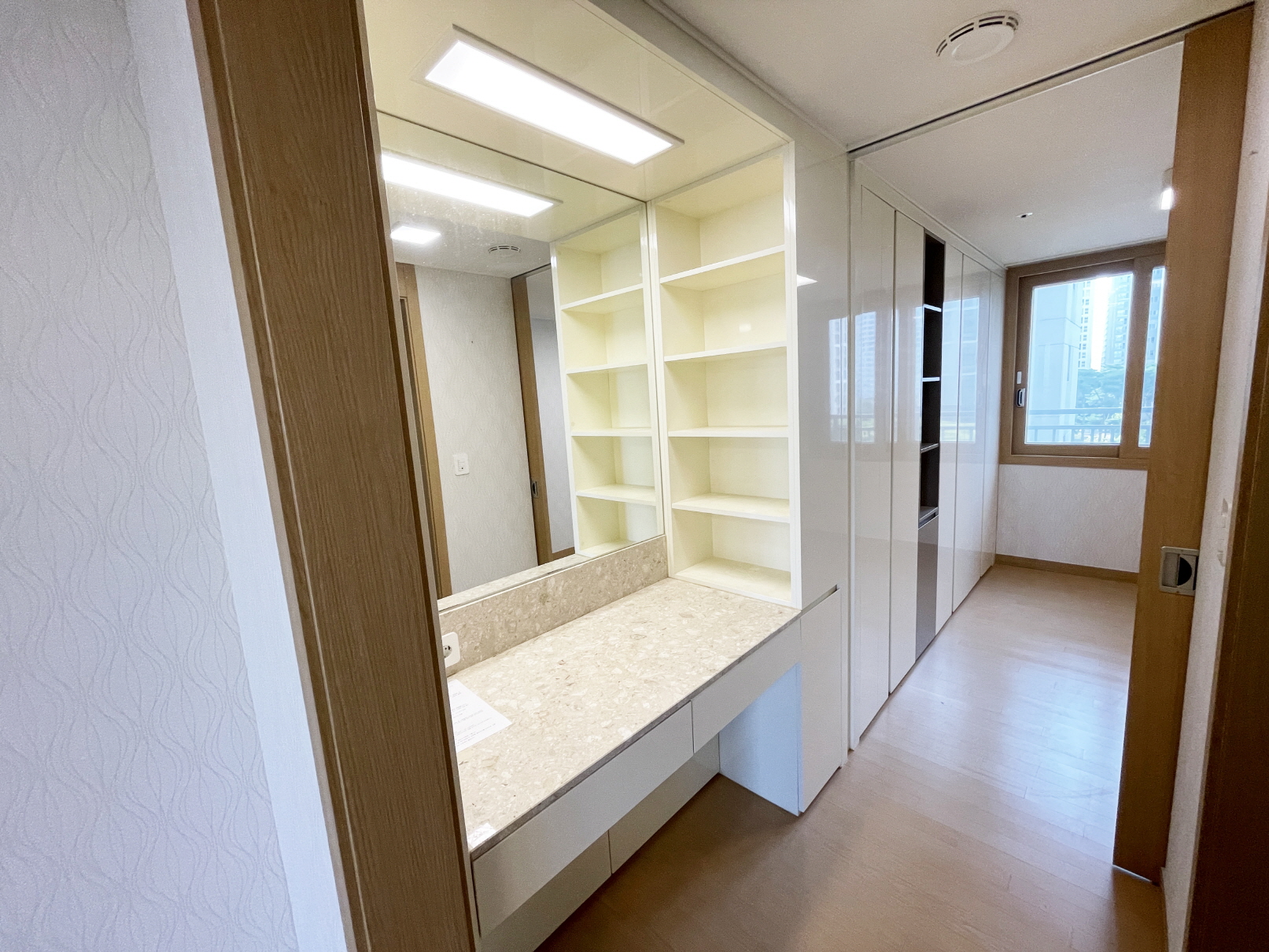 우드 패턴의 벽체에 화이트 컬러 시트지를 시공해 보다 밝은 분위기를 연출했고 팬트리로 통하는 도어는 거울로 교체해 공간감과 실용성을 높였습니다.