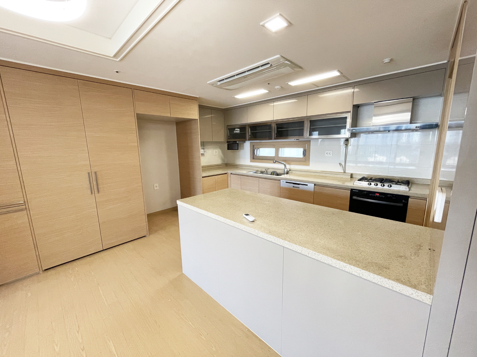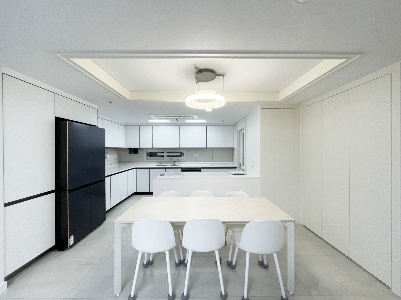 아일랜드 수납장 옆쪽 벽면 수납장은 종전 창이 있던 타입이었는데 모두 화이트 컬러 도어로 교체해 일체감을 주었습니다.