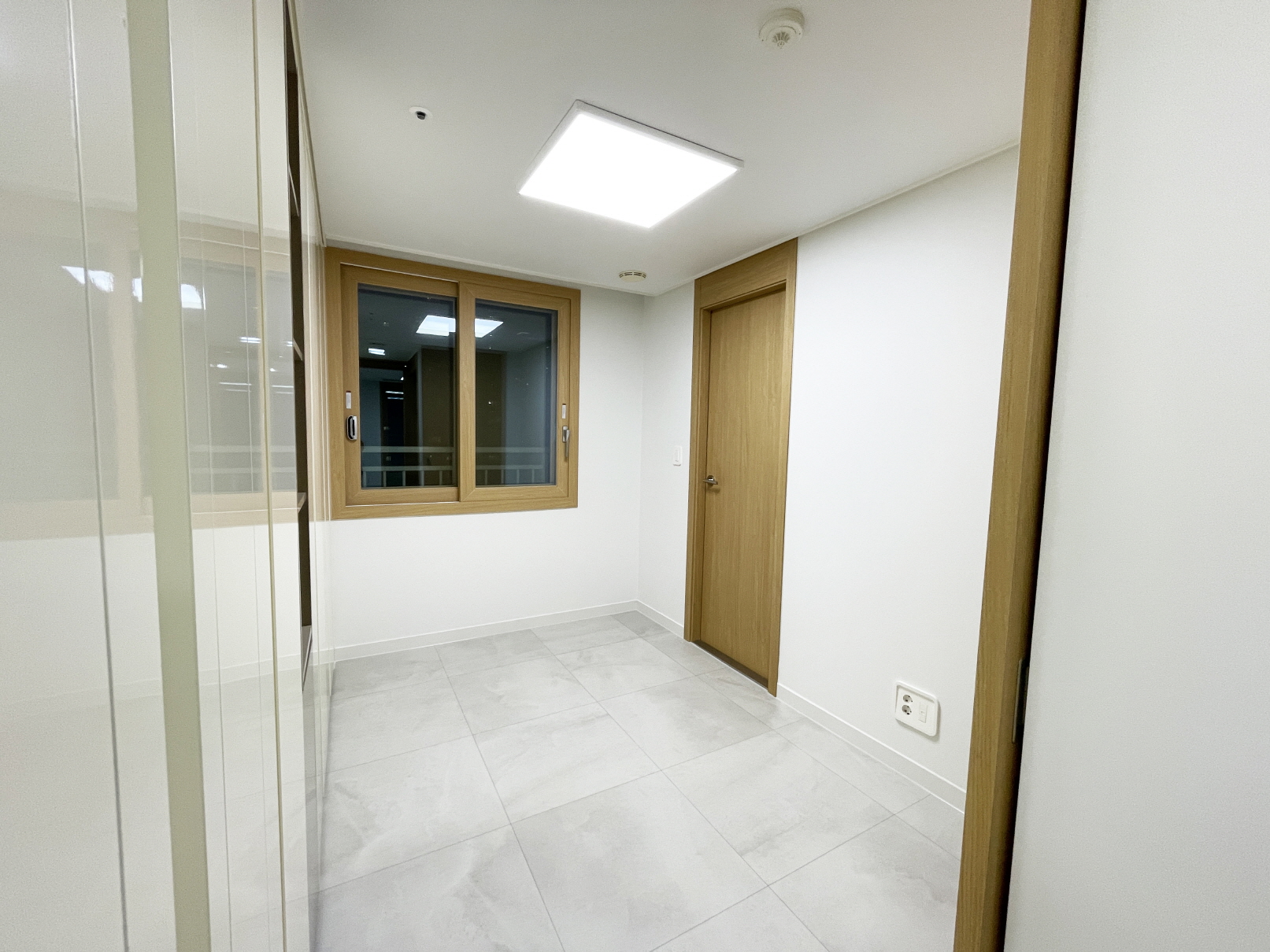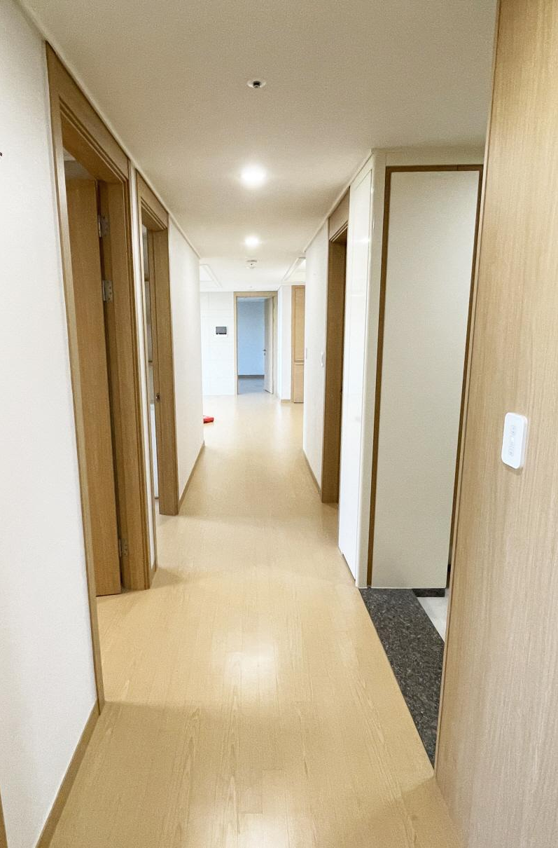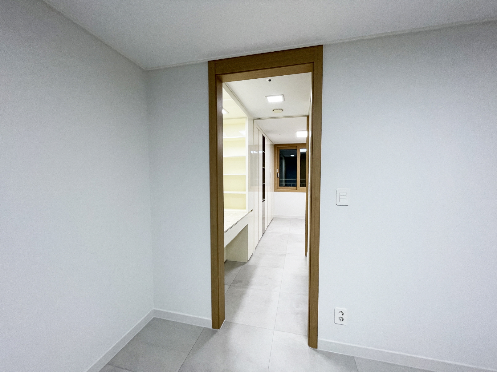 도어 프레임과 도어 모두 화이트 컬러 시트지로 마감했으며 온돌마루였던 바닥은 층간 소음 완화에 도움을 주는 LG엑스컴포트 텐더그레이 장판으로 시공했습니다.