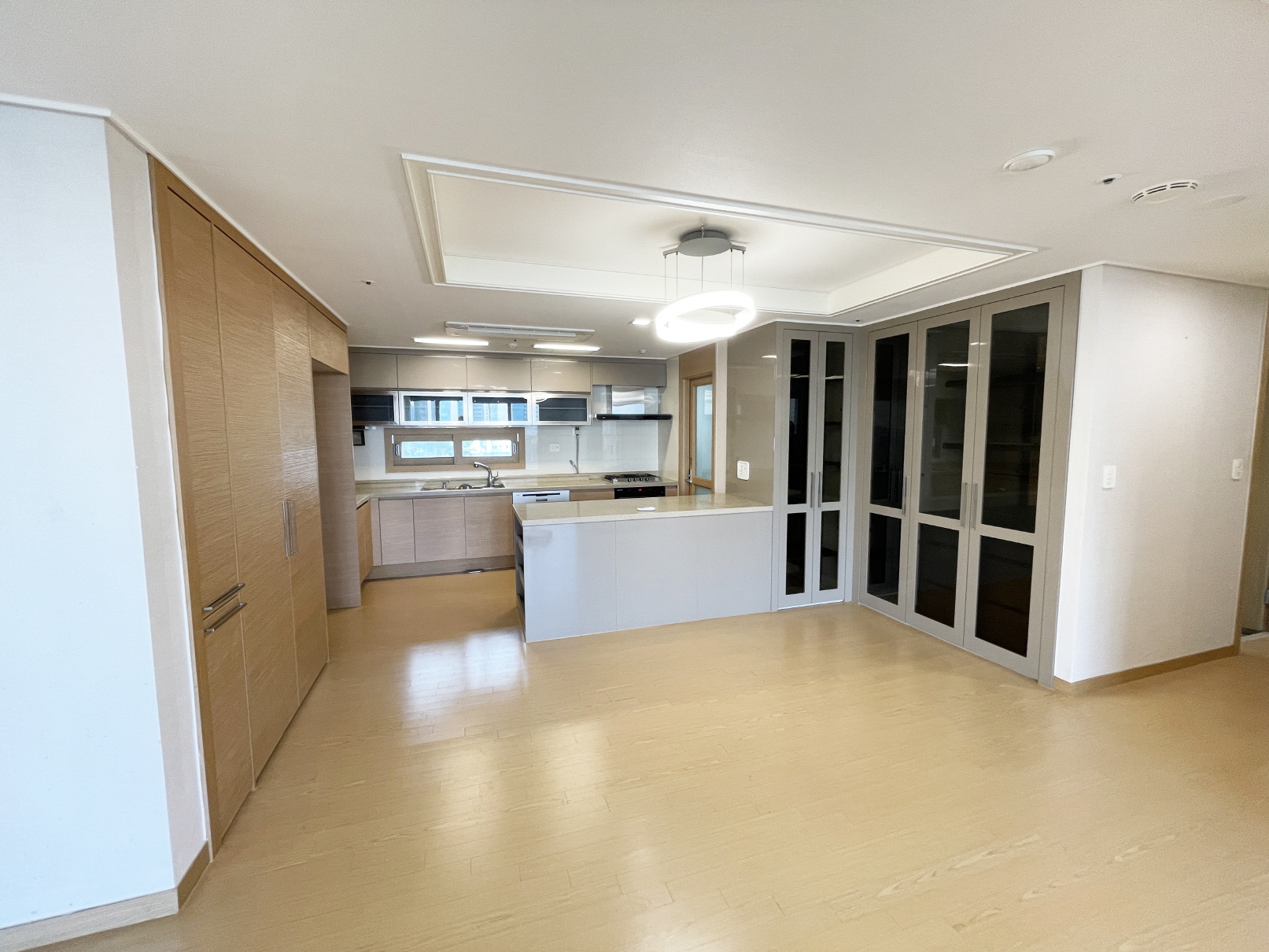 아일랜드 수납장 옆쪽 벽면 수납장은 종전 창이 있던 타입이었는데 모두 화이트 컬러 도어로 교체해 일체감을 주었습니다.