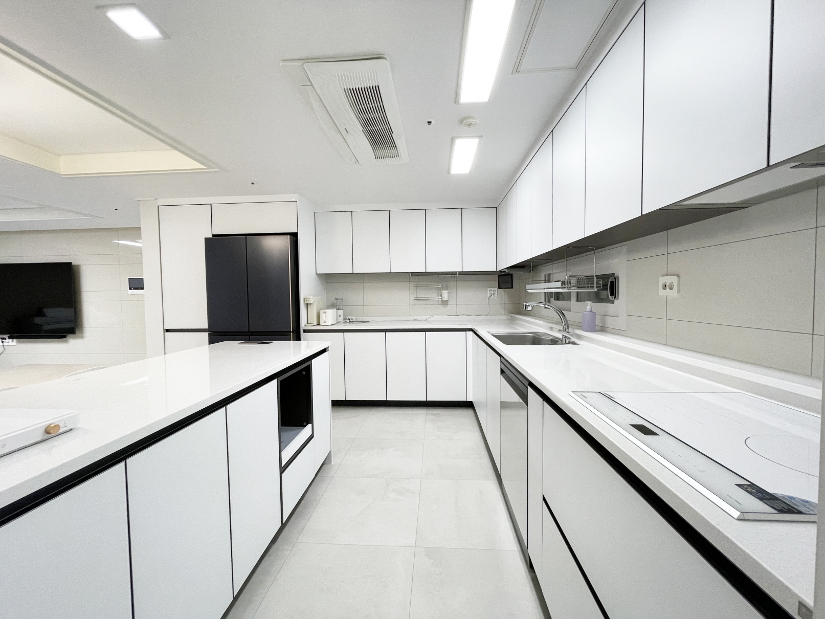 화이트 컬러 주방 가구(글래스 소재), 큼직한 미드웨이 타일의 모습입니다.