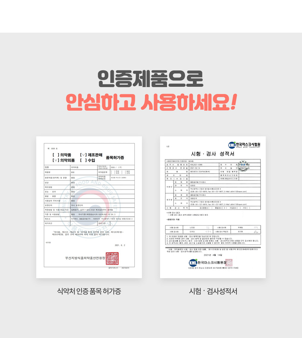 보건용 KF94 마스크로 당연히 식약처 인증이 된 제품입니다.