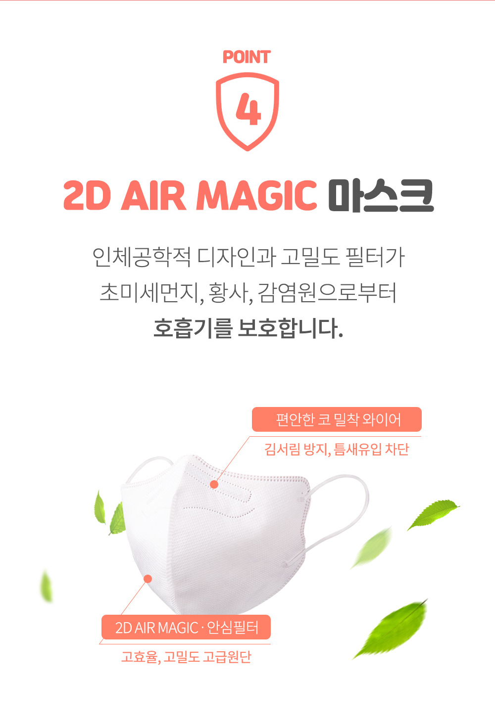 숨 쉴 공간을 충분히 확보한 새부리형 구조로 호흡이 편하며 코 밀착 와이어로 틈새를 차단하고 김서림을 방지합니다.