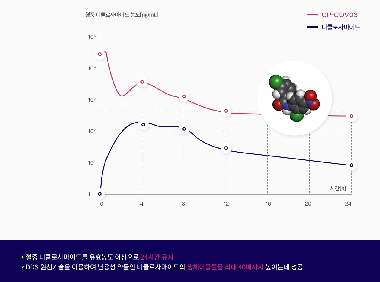 니클로사마이드 단독 사용 대비 CP-COV03의 혈중 니클로사마이드 농도가 훨씬 오래 유지된다.
