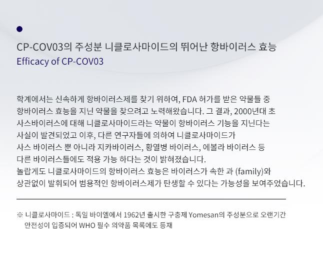 니클로사마이드의 생체이용률 난제를 나노하이브리드 기술로 극복한 제프티(CP-COV03)는 코로나19에 대한 게임체인저가 될 수 있는 가능성을 여러 자료로 보여주고 있다.