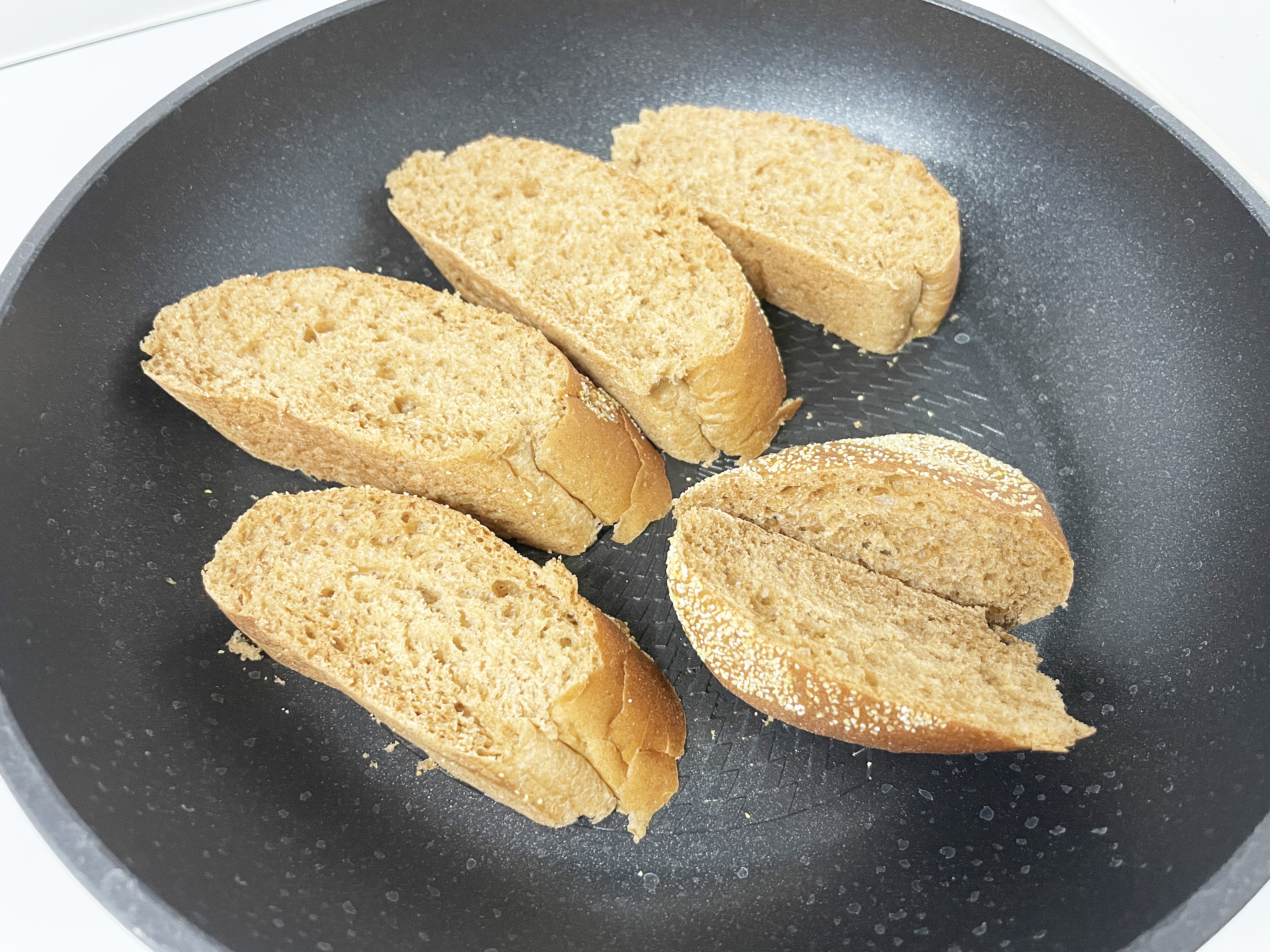 브라운 브레드는 6조각으로 잘라서 마른 팬에 약불로 노릇하게 구워줍니다.