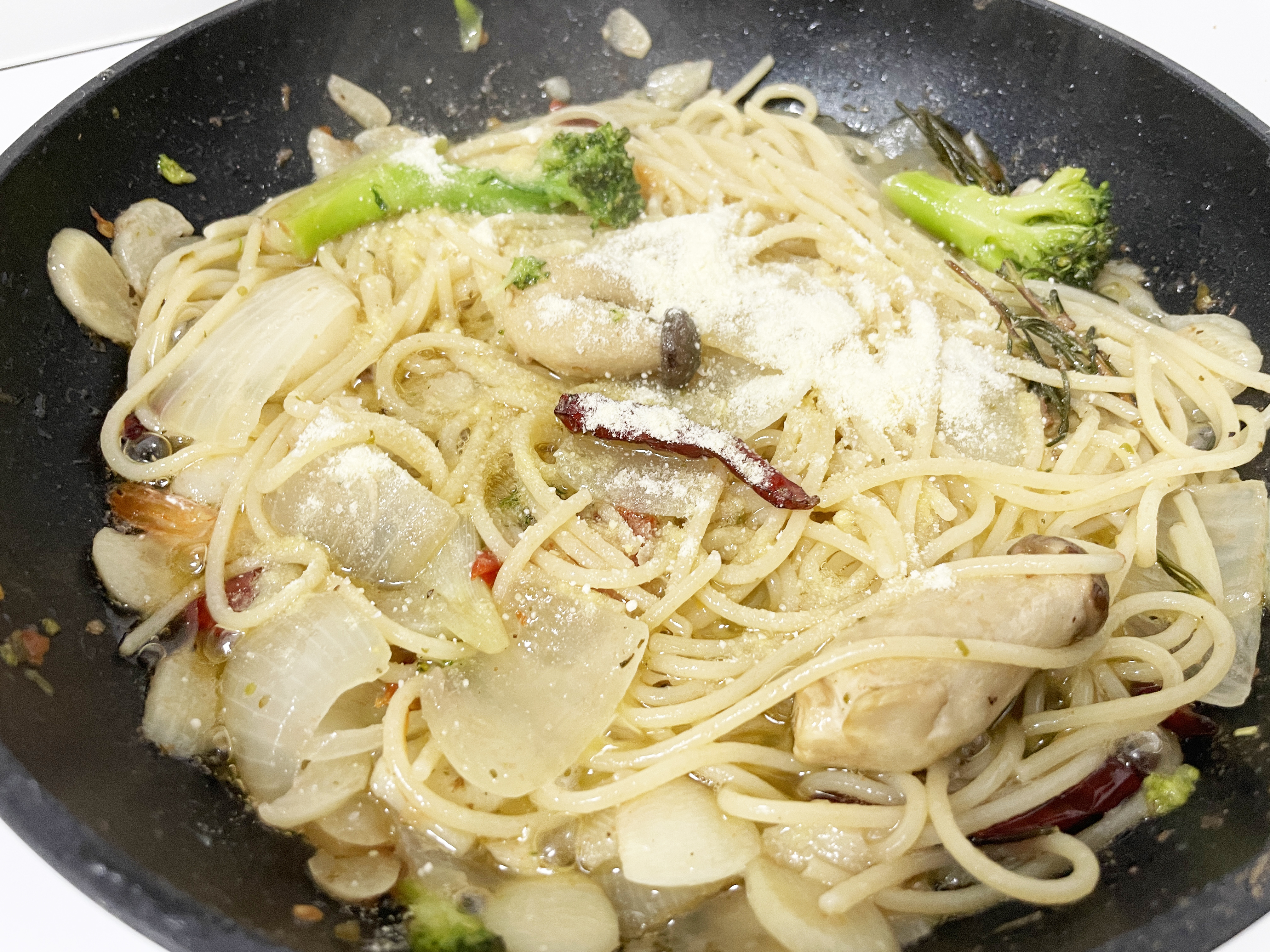 방울토마토, 양파, 브로콜리, 미니새송이, 건파스타면, 브라운브레드, 로즈마리, 베트남고추, 이탈리안 시즈닝, 파마산 치즈가루, 소금, 올리브오일, 마늘, 새우