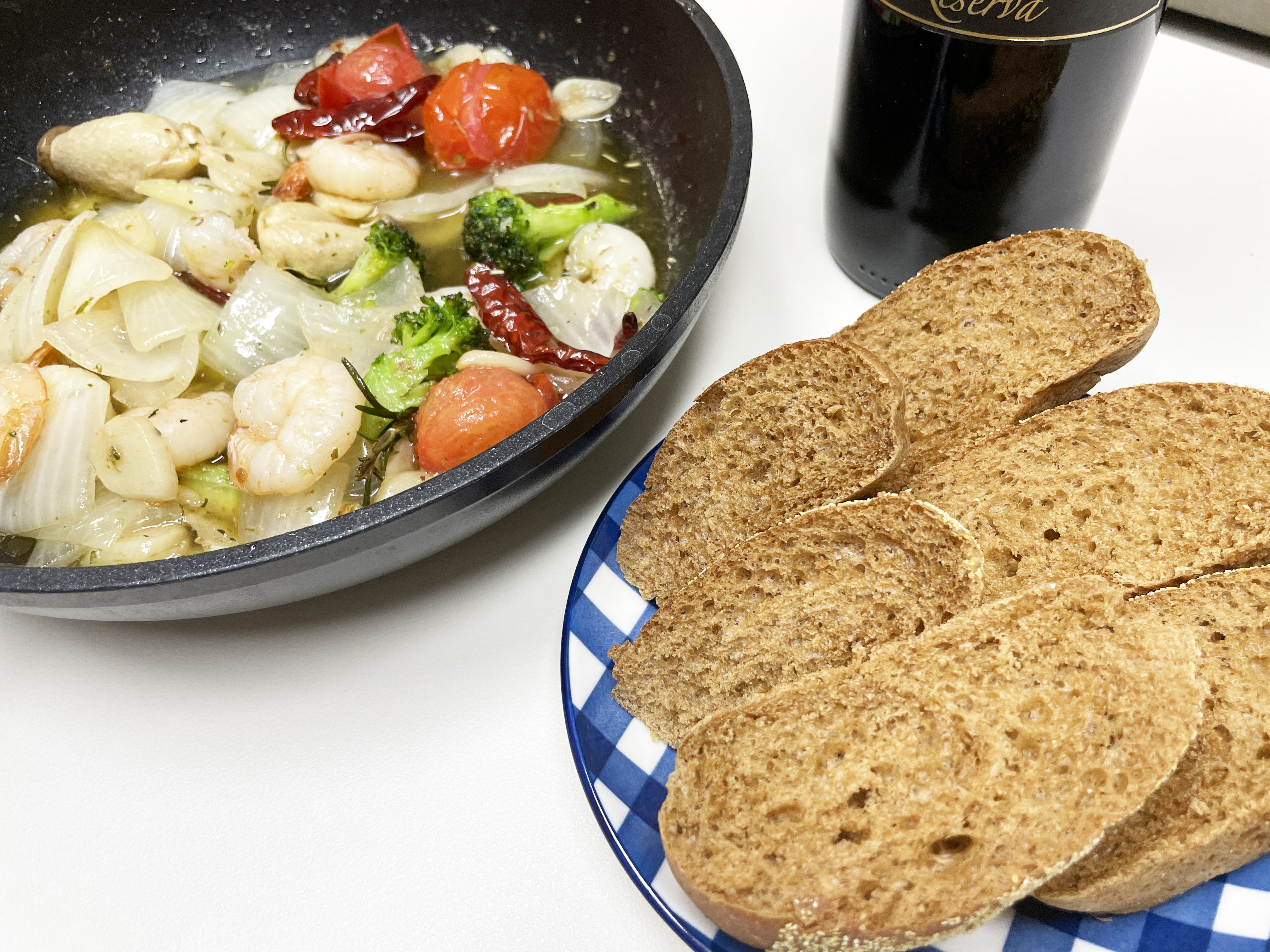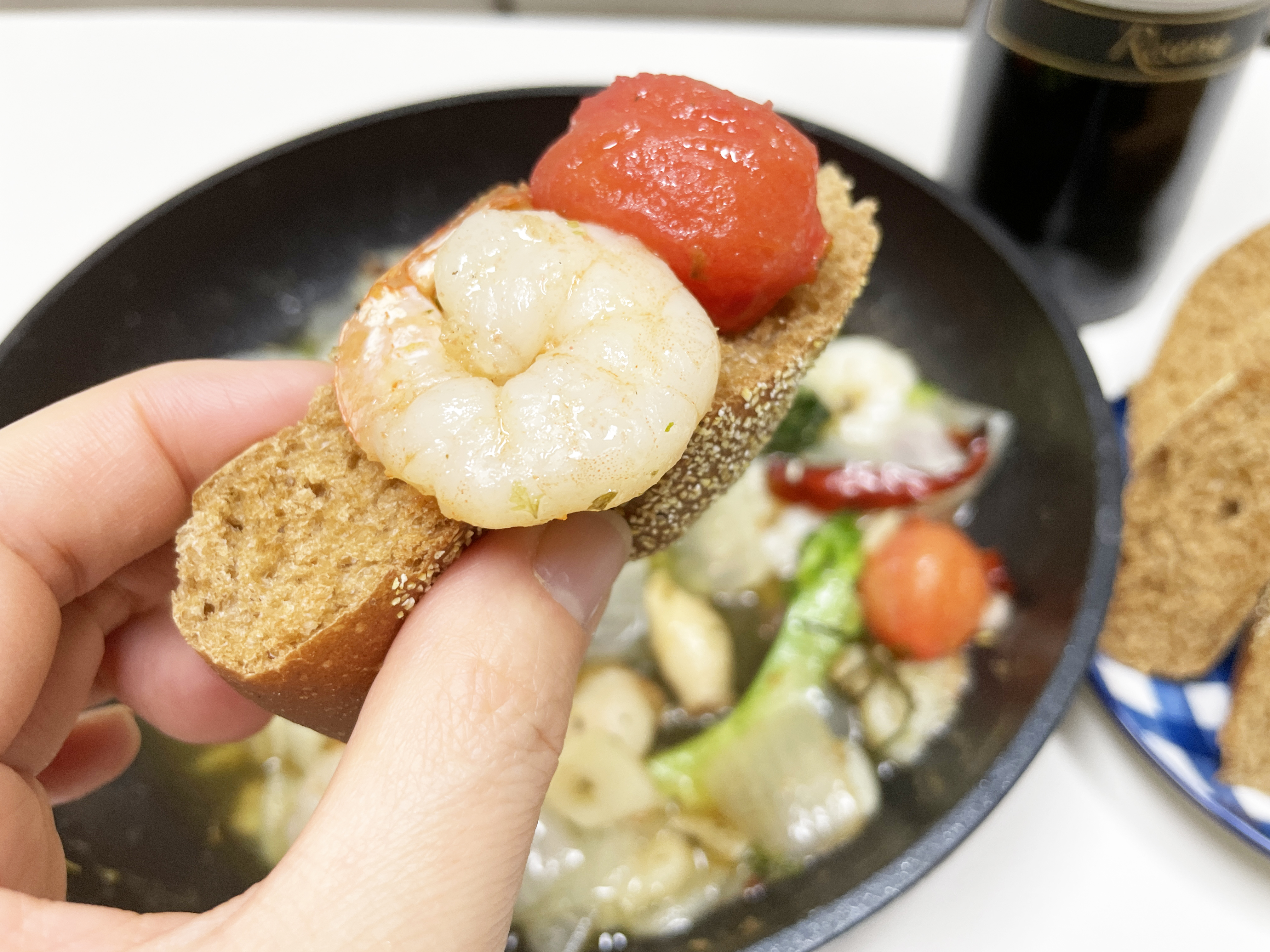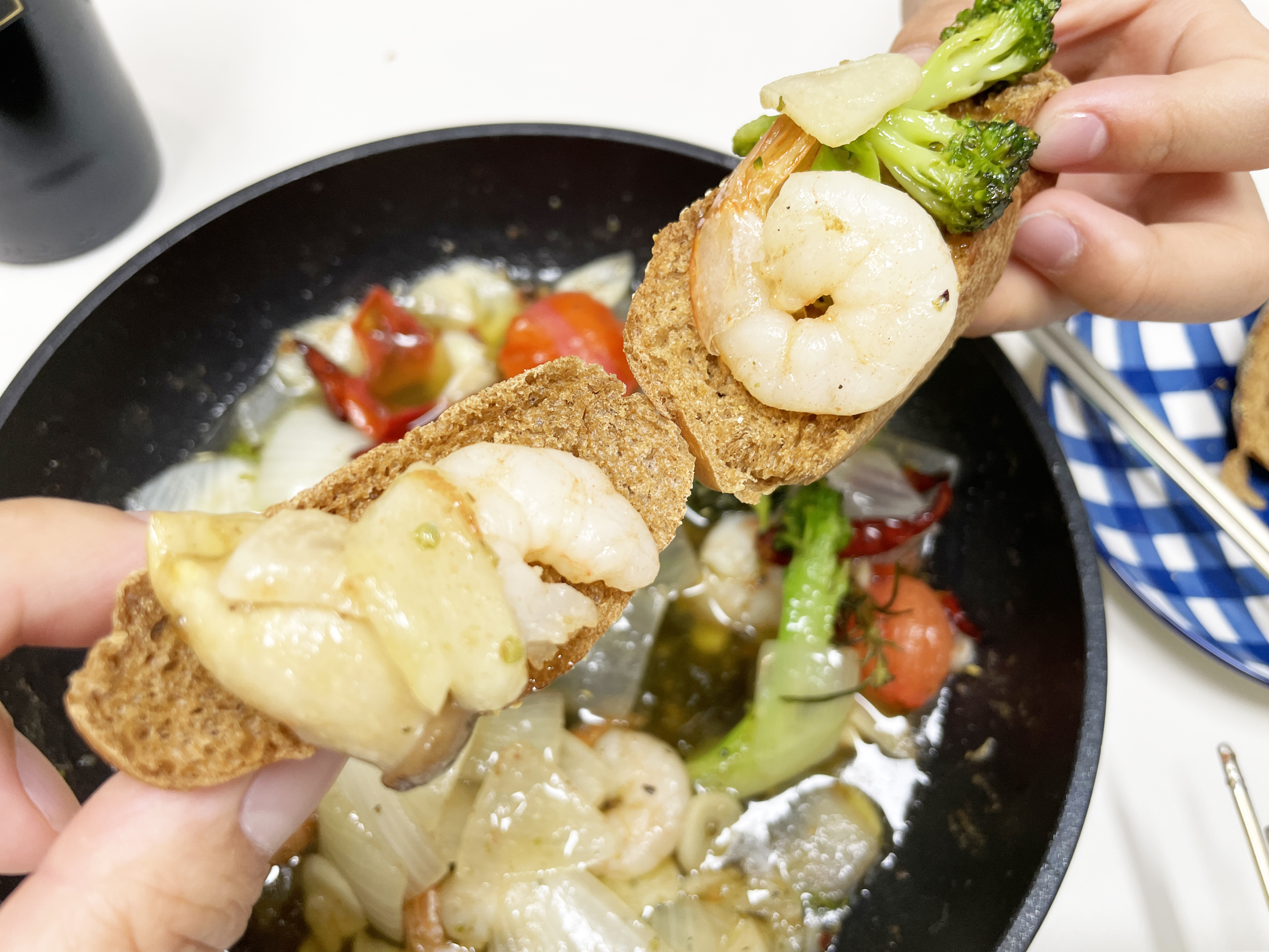 새우 물기 제거해주고, 브레드 잘라서 구워주고, 올리브오일에 마늘 넣고 새우를 끓인 후 시즈닝·소금 넣고 채소 등 때려 넣고 끓여줍니다.