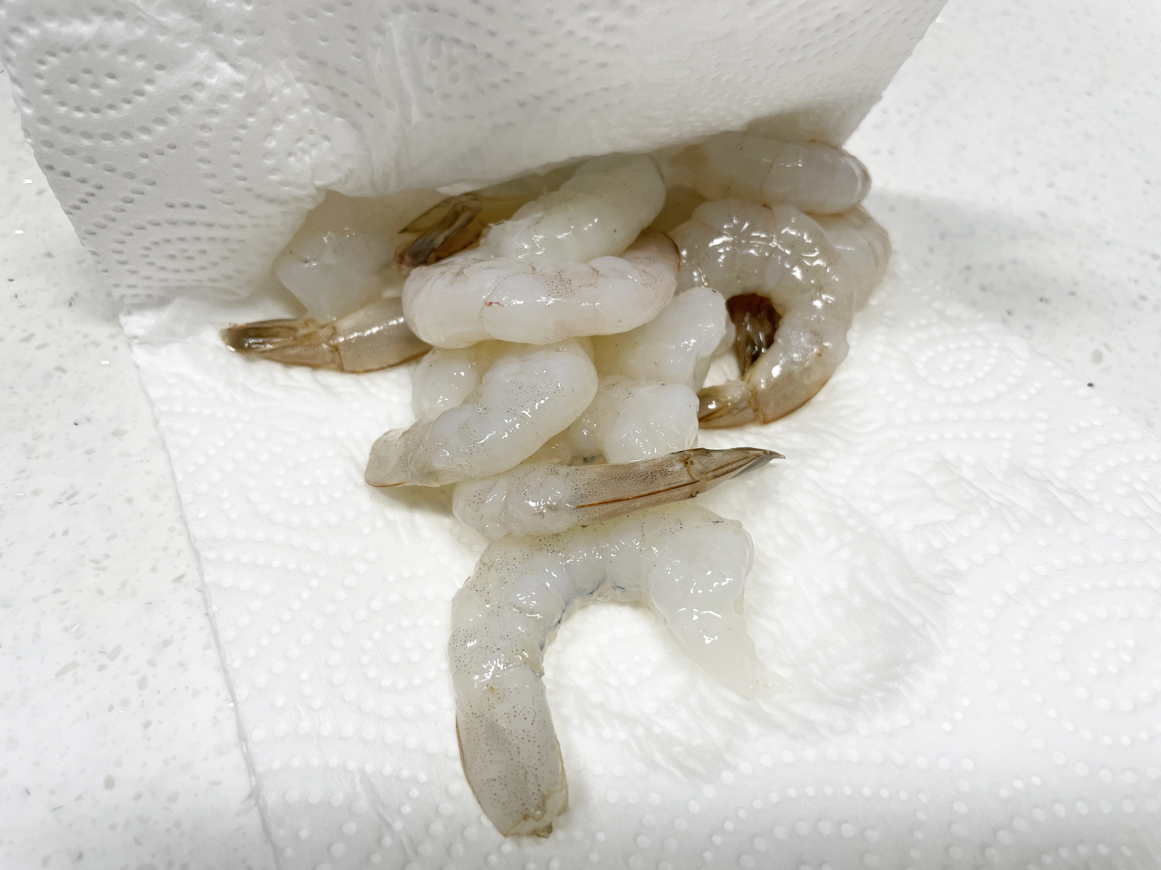 감바스의 주재료, 싱싱한 새우의 물기를 빼줍니다.