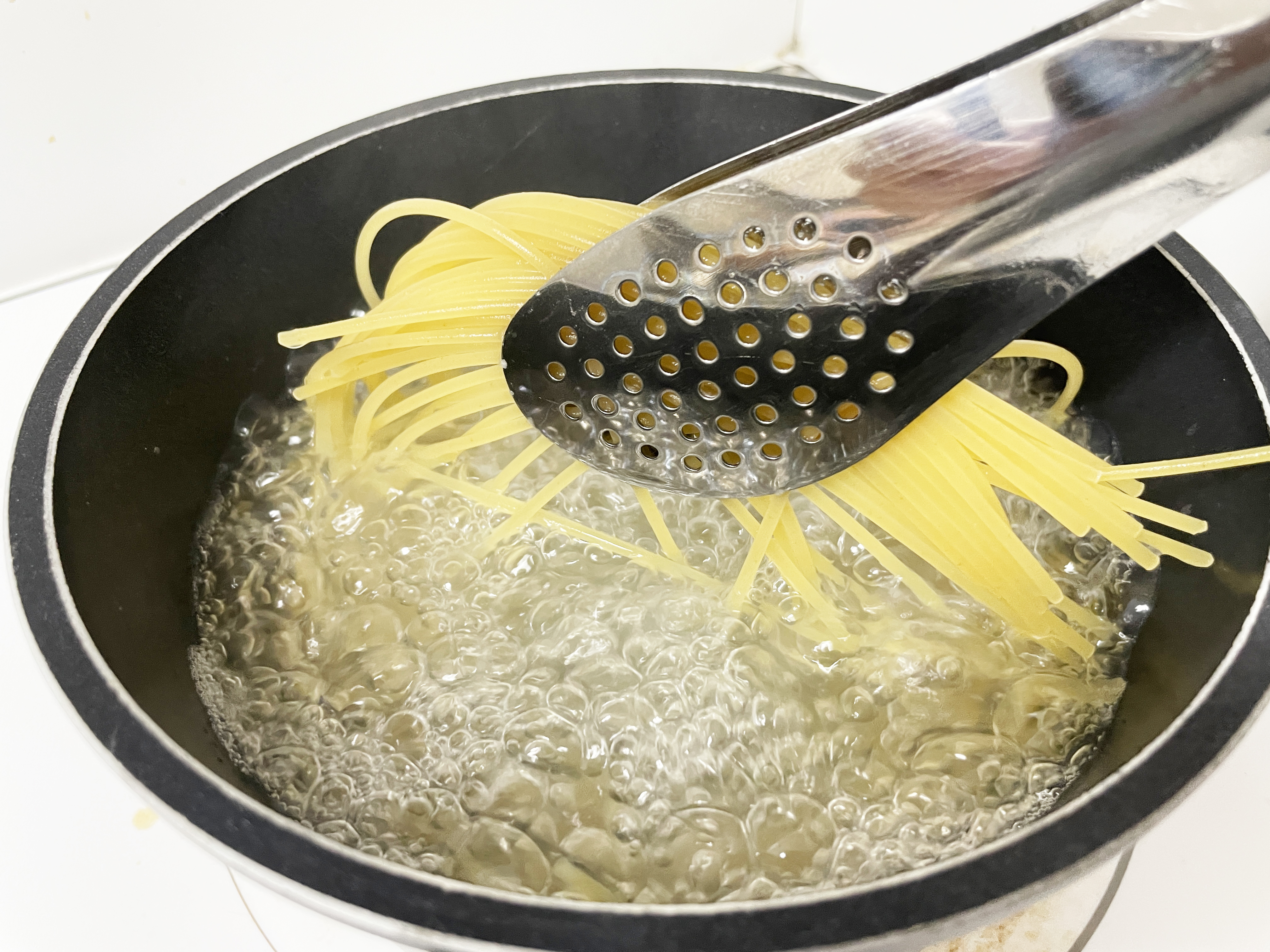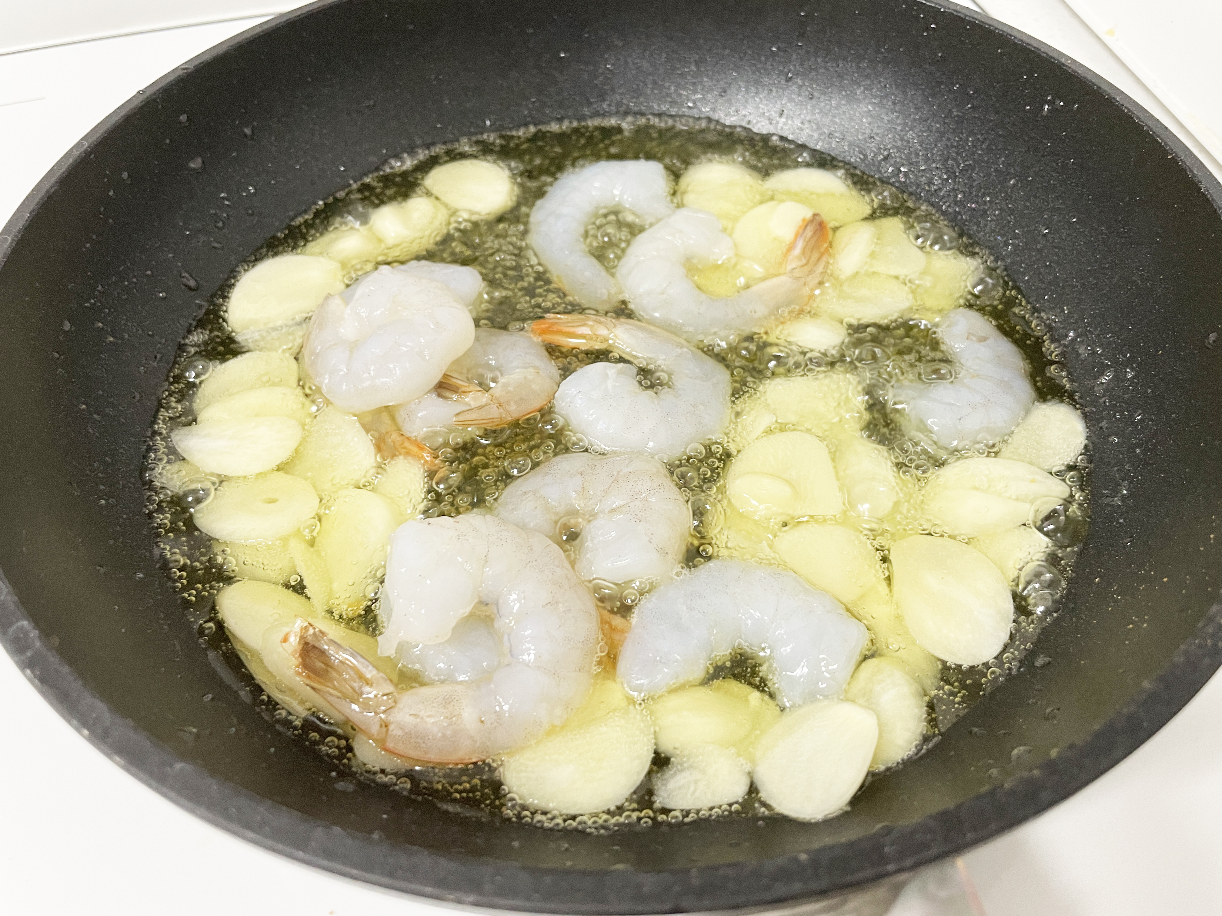 끓는 물에 파스타면을 7분간 삶은 후 건져내어 남은 감바스가 있는 팬에 넣고 1분간 볶아줍니다.