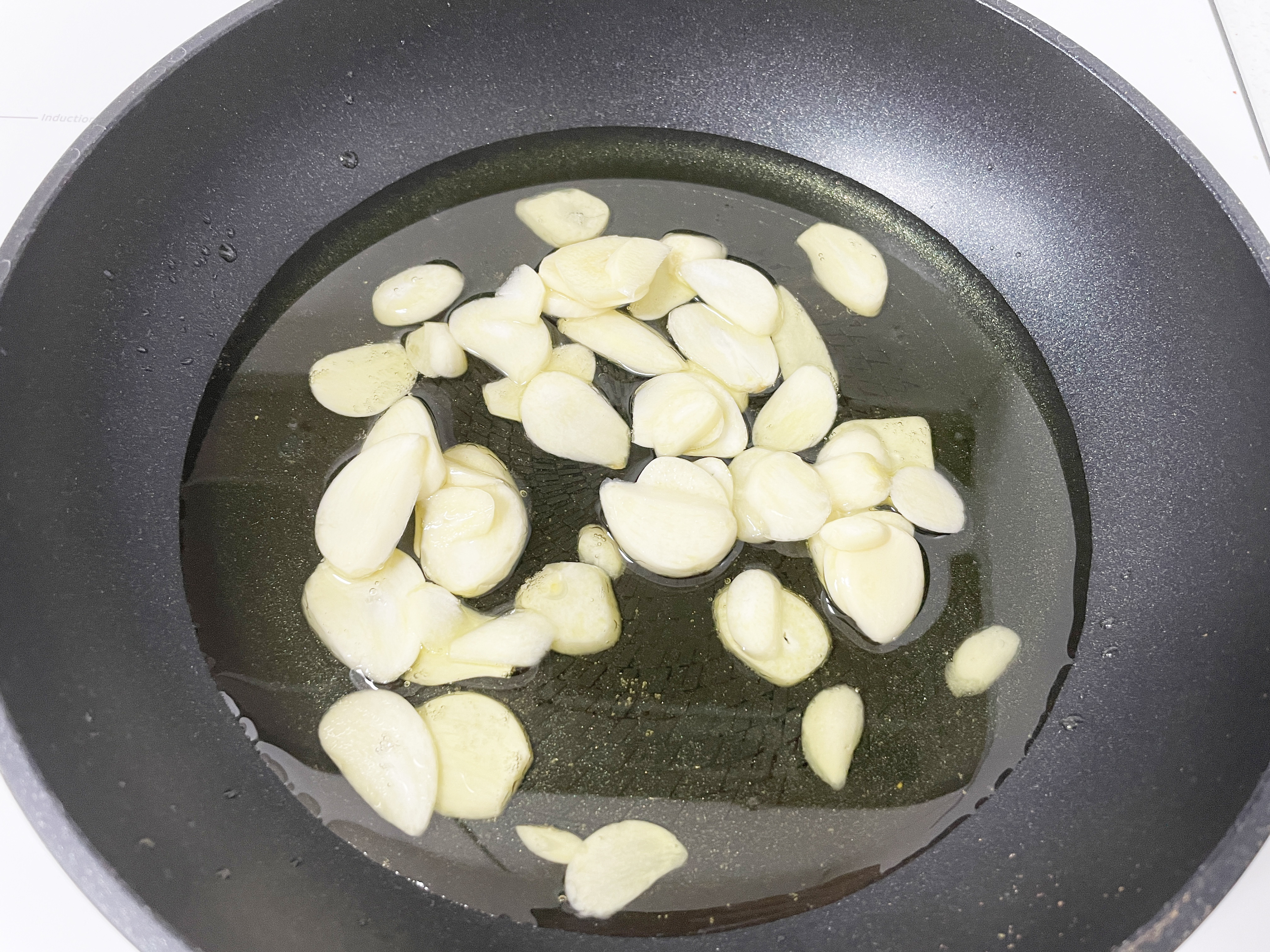 요리의 기본이죠. 올리브오일에 마늘을 넣고 약불로 3분간 끓여줍니다.