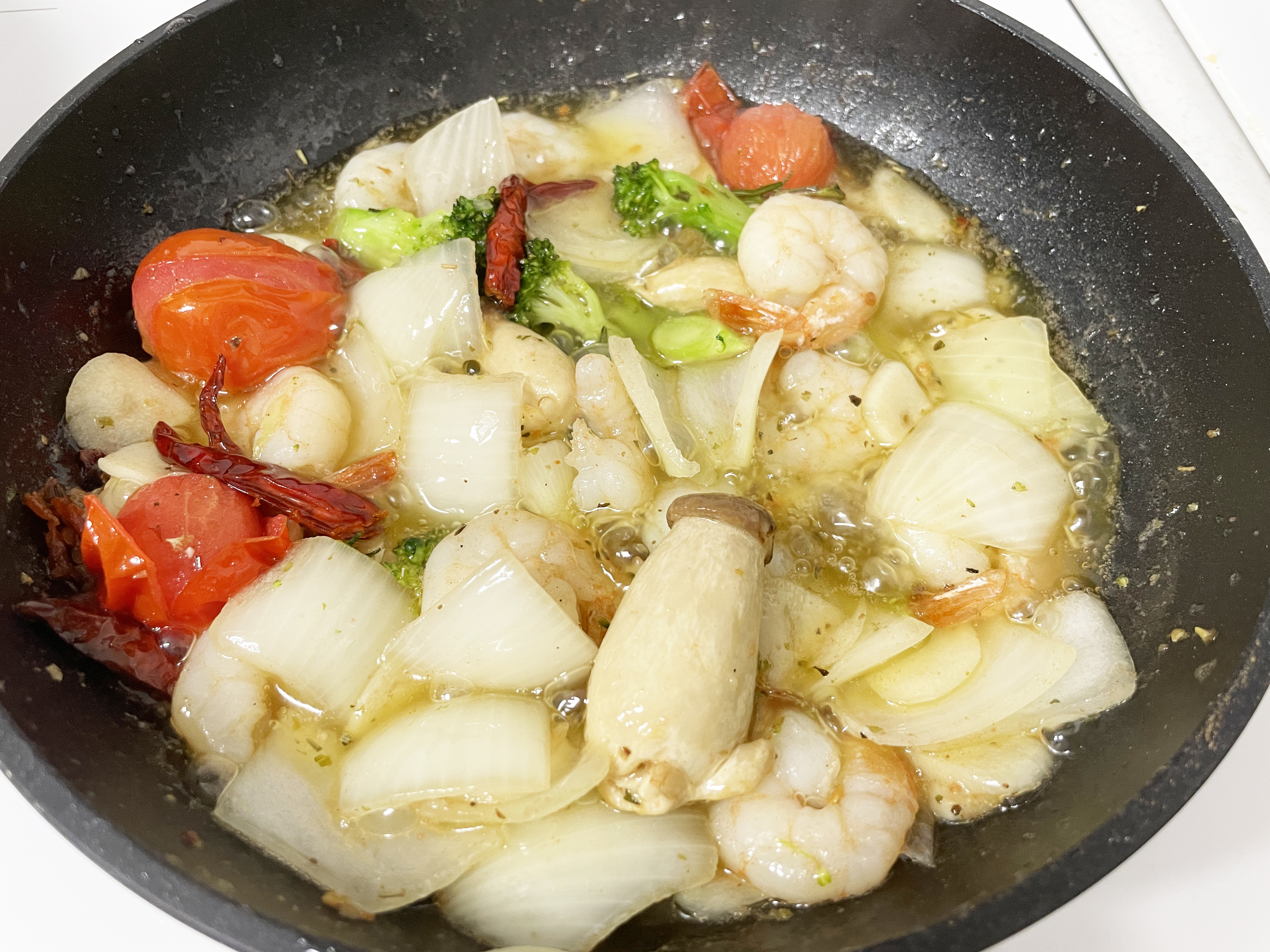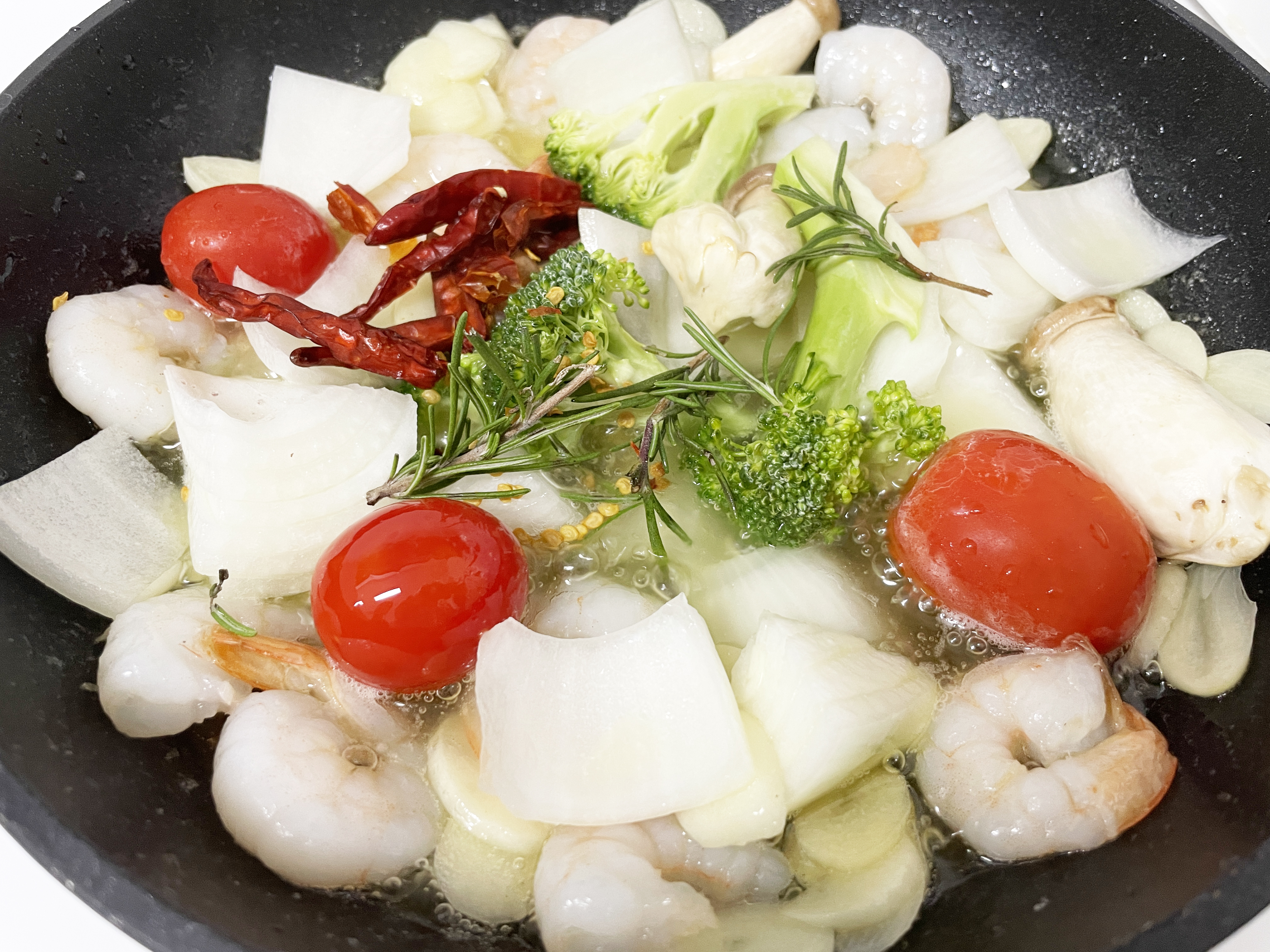 새우를 끓인 팬에 채소와 로즈마리, 이탈리안 시즈닝, 소금을 넣고 약불로 3분간 끓여줍니다.