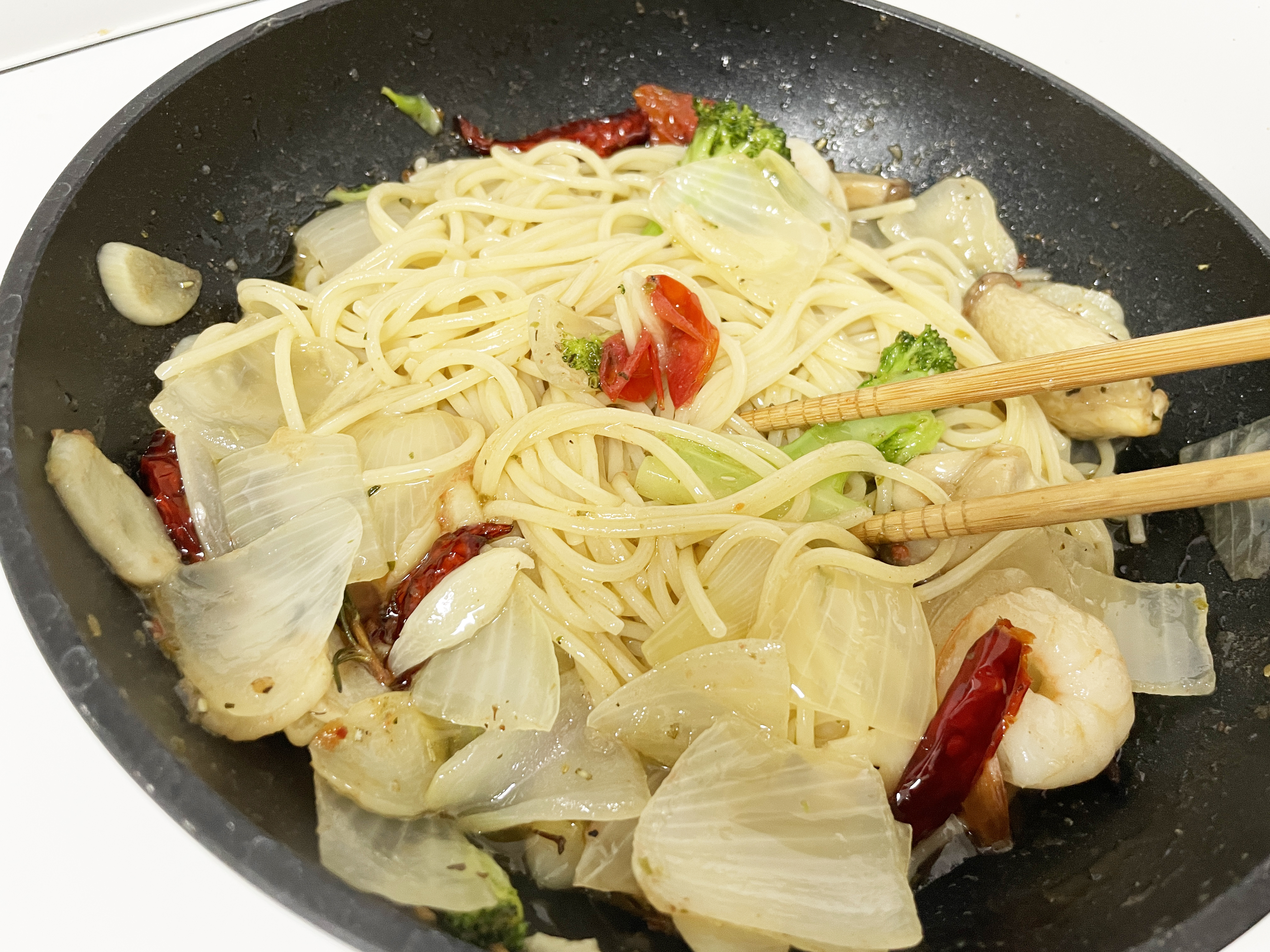 끓는 물에 파스타면을 7분간 삶은 후 건져내어 남은 감바스가 있는 팬에 넣고 1분간 볶아줍니다.