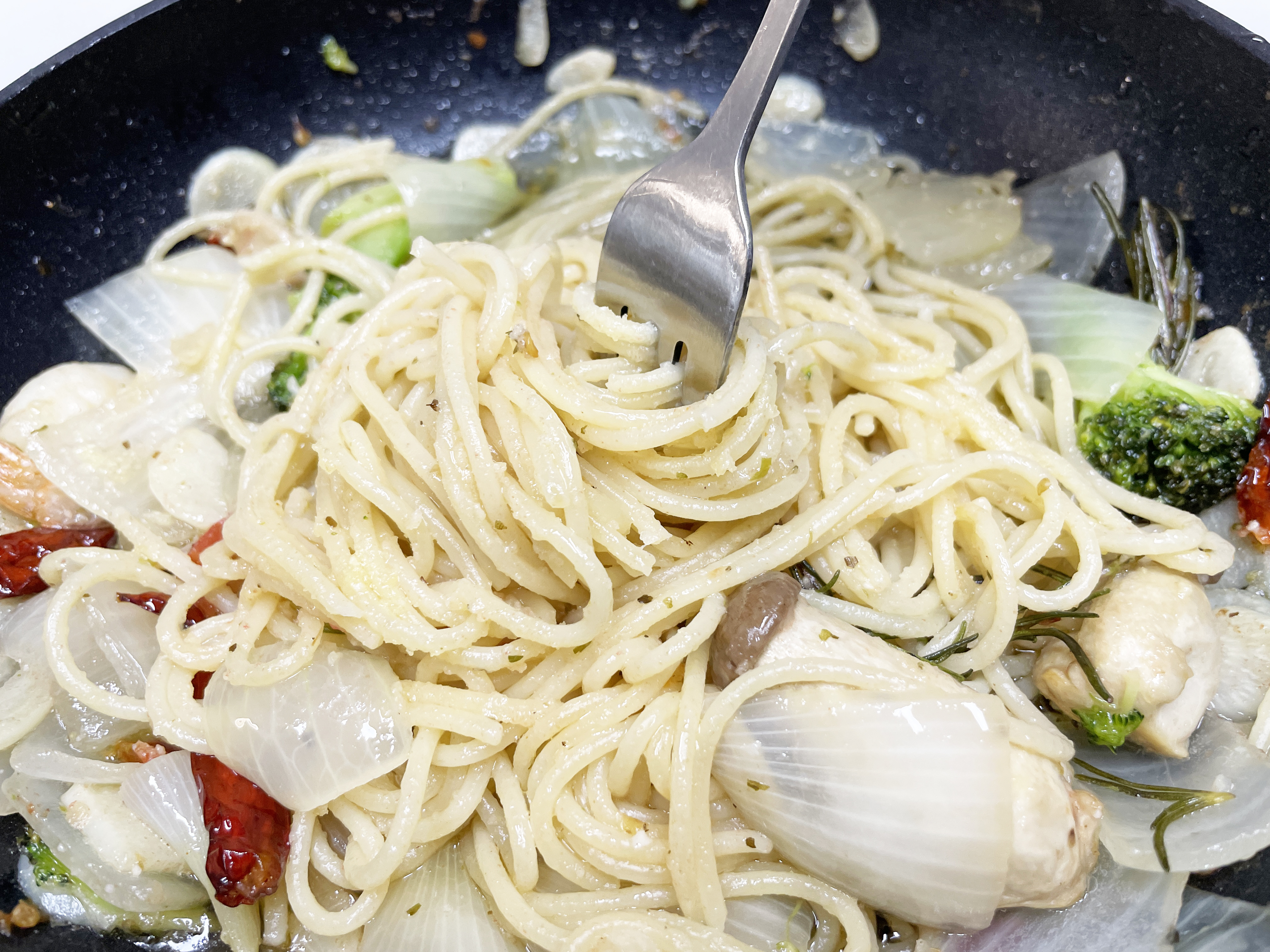 방울토마토, 양파, 브로콜리, 미니새송이, 건파스타면, 브라운브레드, 로즈마리, 베트남고추, 이탈리안 시즈닝, 파마산 치즈가루, 소금, 올리브오일, 마늘, 새우