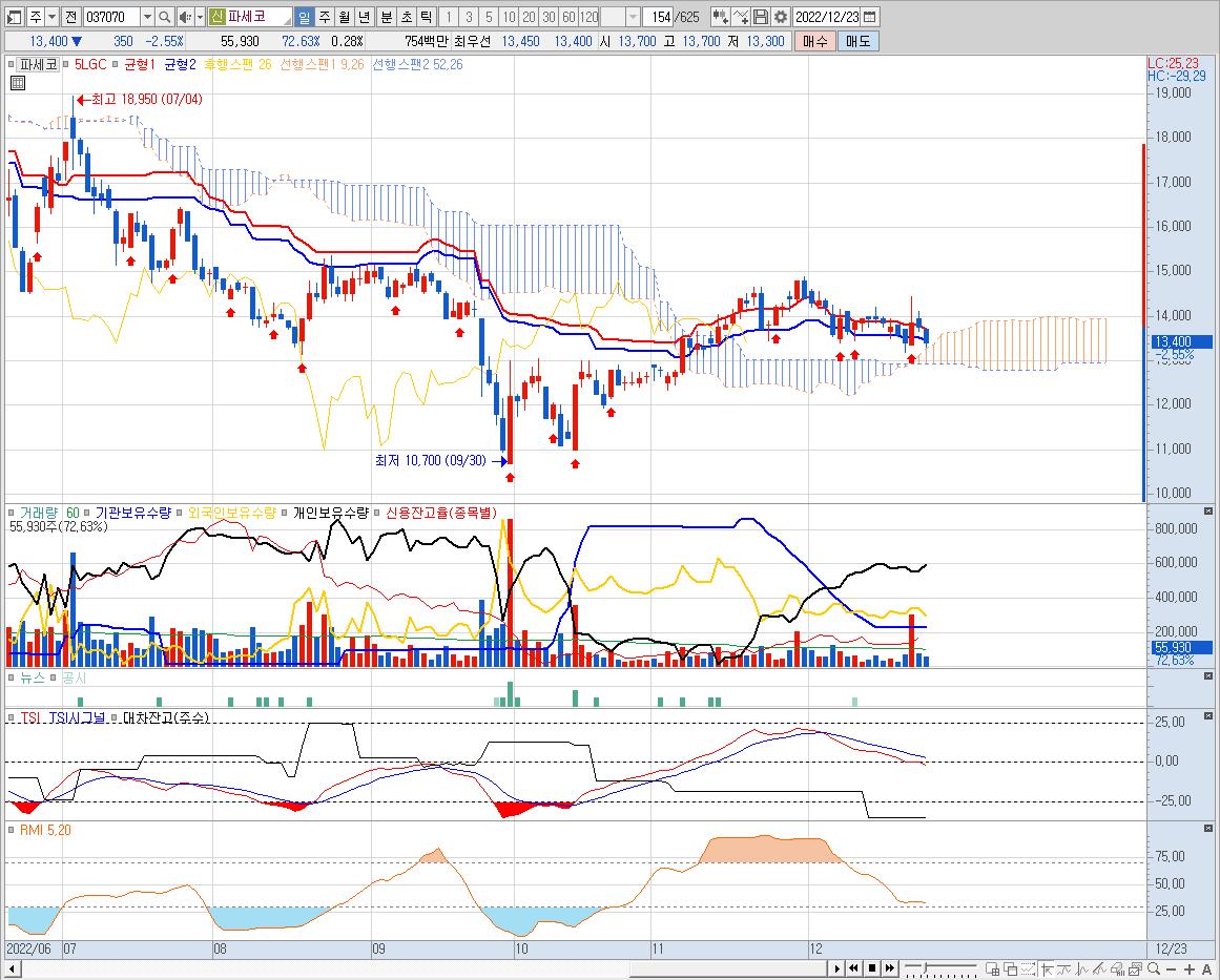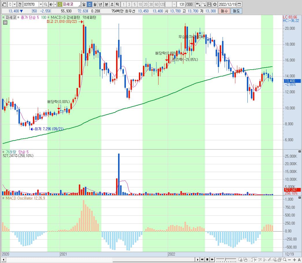 장기간 가파른 상승세를 보여온 주가가 20개월선 아래로 빠진 상태.