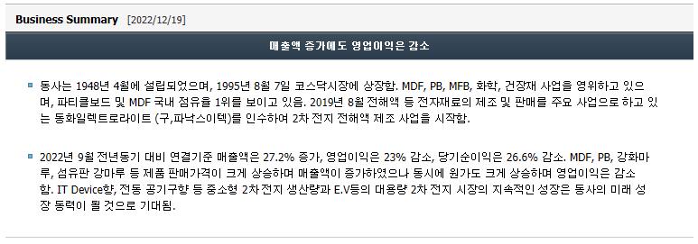 동화기업은 2차 전지가 메인 사업은 아니지만 2차 전지향 실적이 작게나마 발생하고 있는 기업.