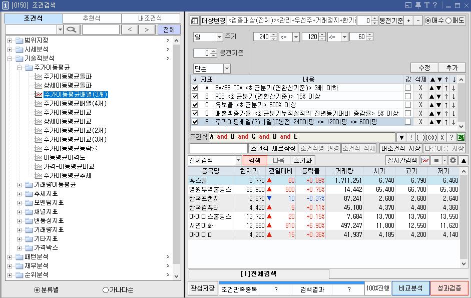 일봉상 이동평균선 배열을 240일, 120일, 60일 기준 정배열로 설정하니 7개 종목으로 추려졌다.