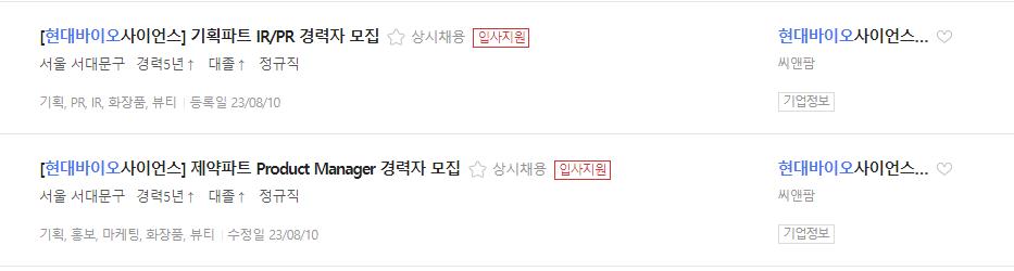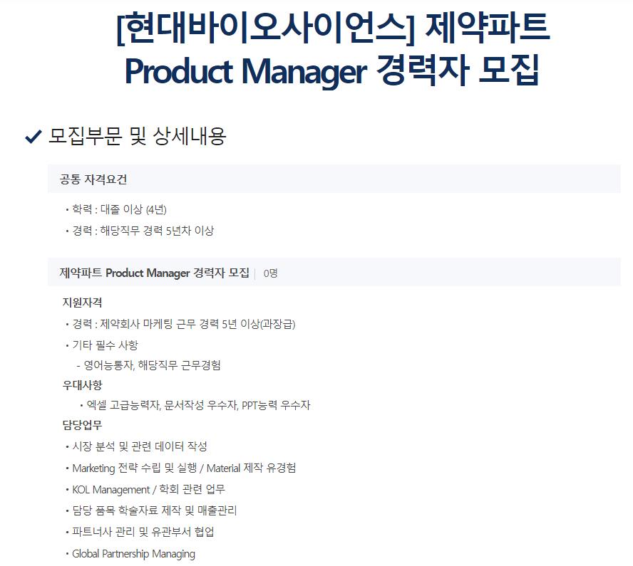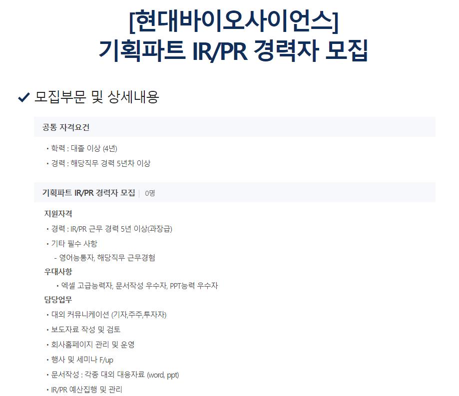 현대바이오 IR/PR 및 제약파트 PM 채용 공고
