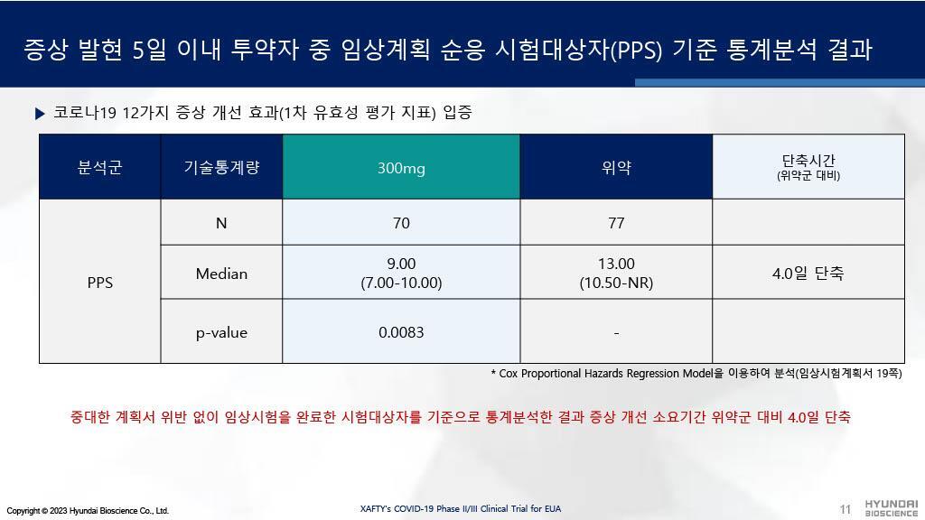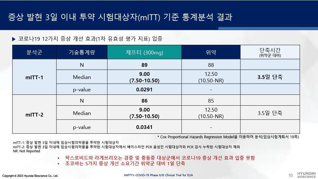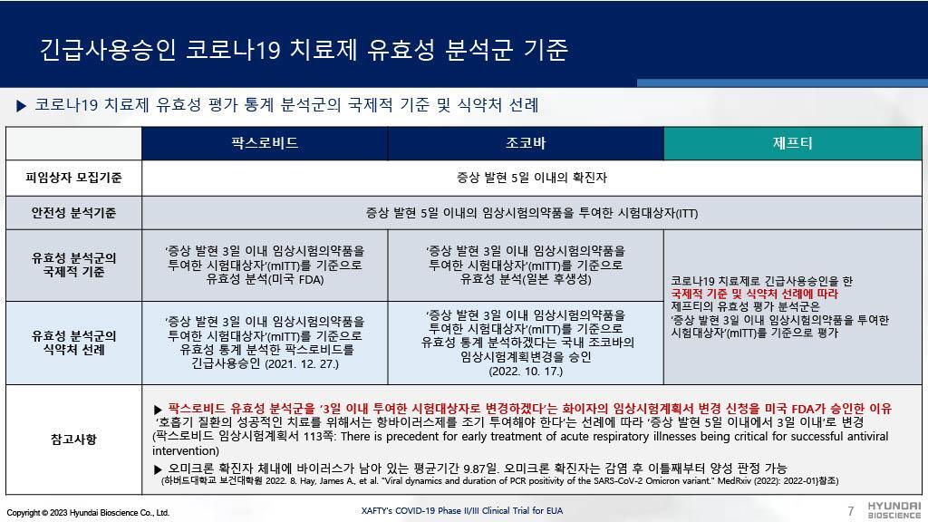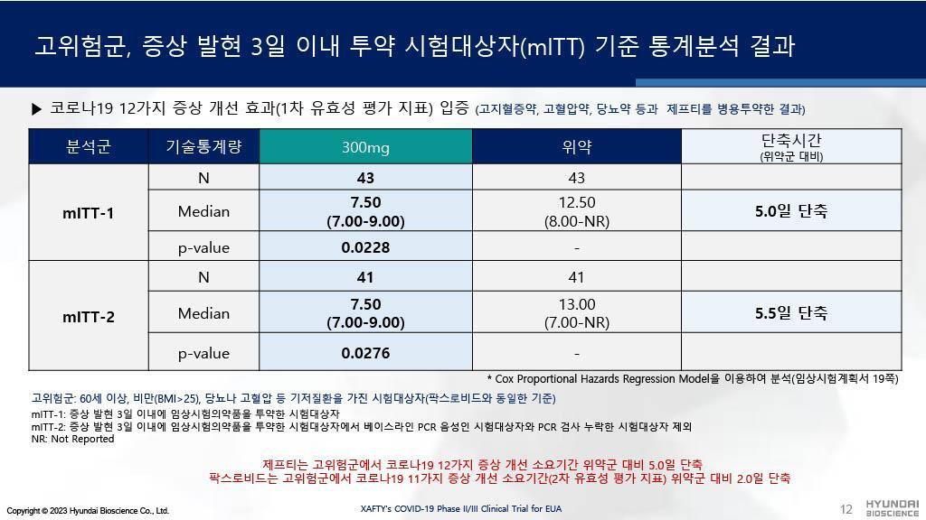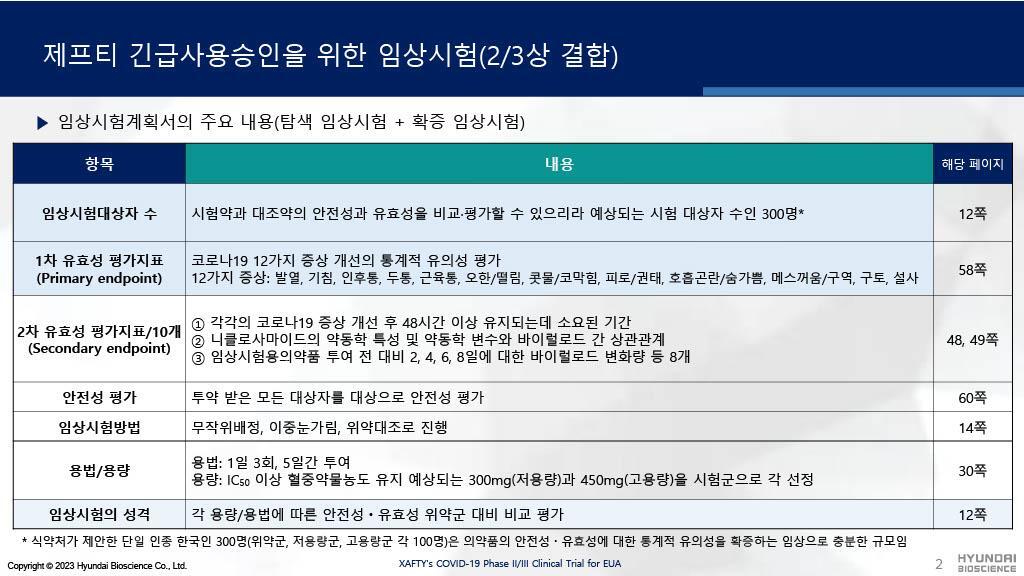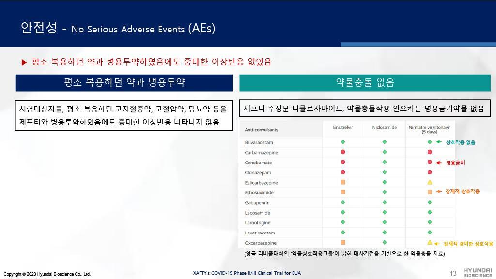 현대바이오의 제프티는 병용금기약물이 많아 복약지도가 어려웠던 팍스로비드와 달리 임상시험시 평소 복용하던 약과 병용투약하였음에도 중대한 이상반응이 없었음을 보여주고 있습니다.