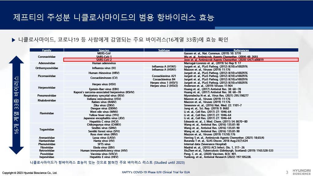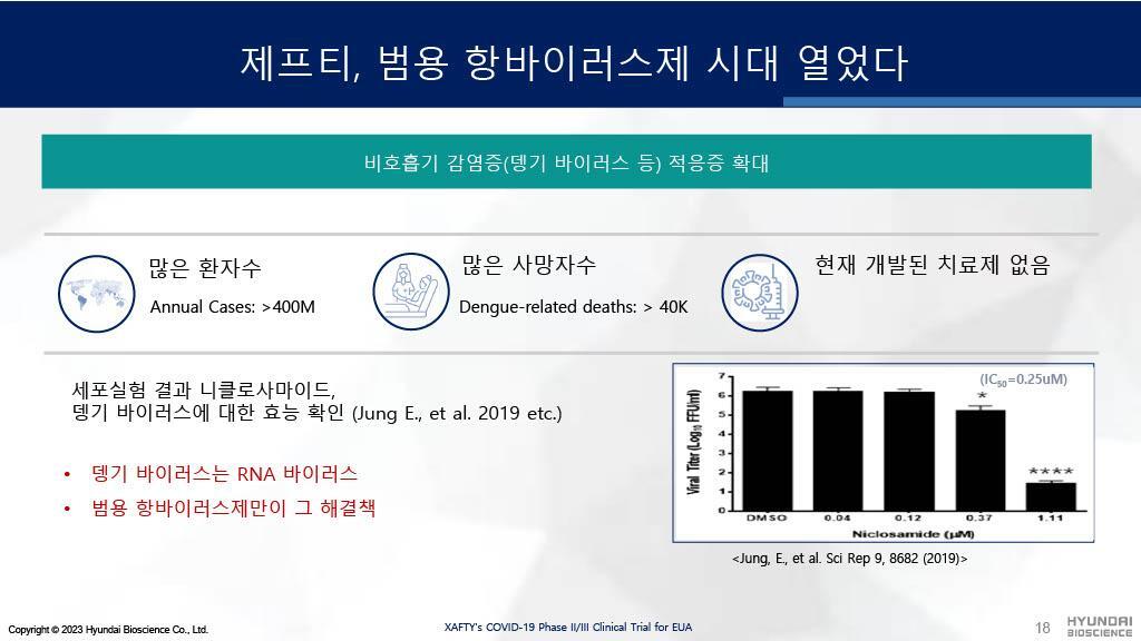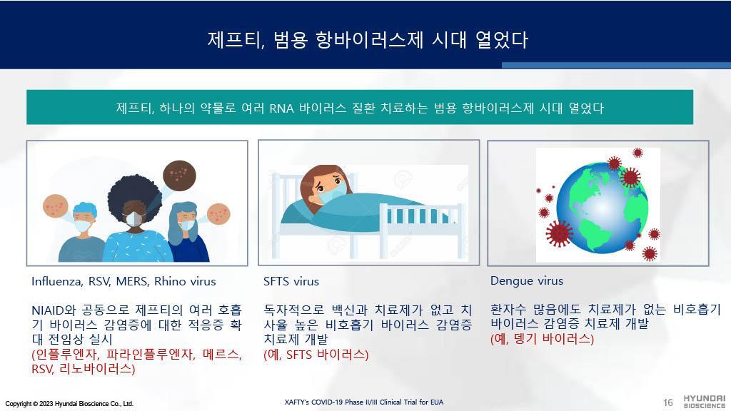 뿐만 아니라 제프티는 현재 외국에서 확산되고 있는 뎅기열(뎅기 바이러스)을 비롯해 수많은 바이러스에 대응 가능한 범용 항바이러스제로 임상을 거쳐 적응증 확대를 증명할 것입니다.