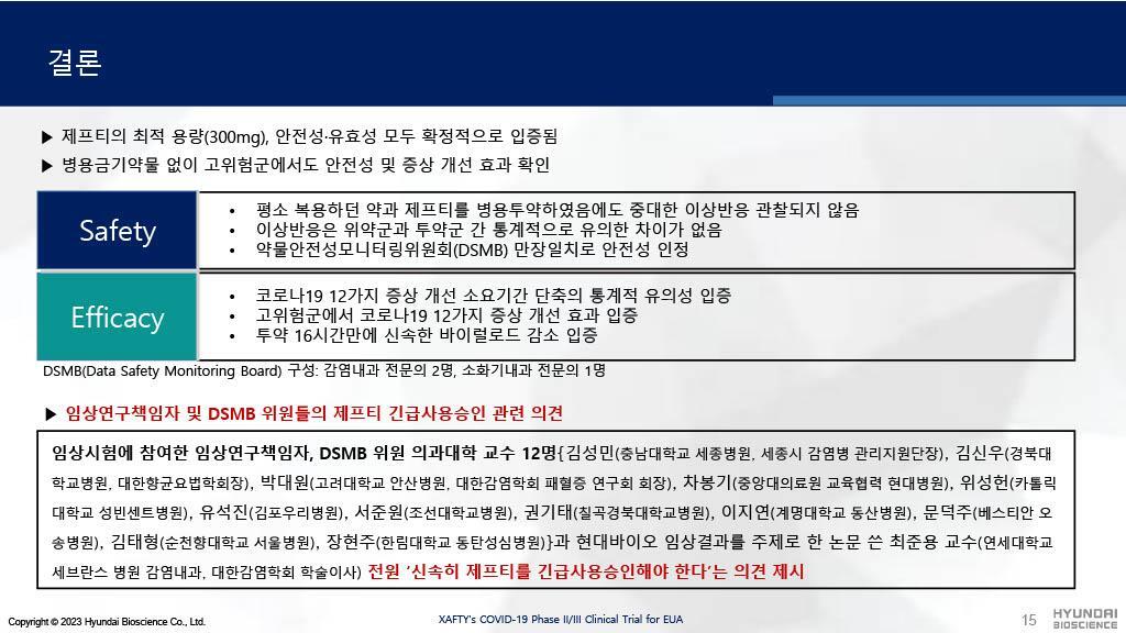 코로나19의 12가지 증상 개선을 확실히 보여주며 복약지도가 쉬운 제프티는 코로나19 경구용 치료제로서 현존 가장 뛰어난 약물로, 다수의 임상연구책임자 및 DSMB 위원들이 실명을 공개하며 '신속히 제프티를 긴급사용승인해야 한다'는 의견을 제시했습니다.