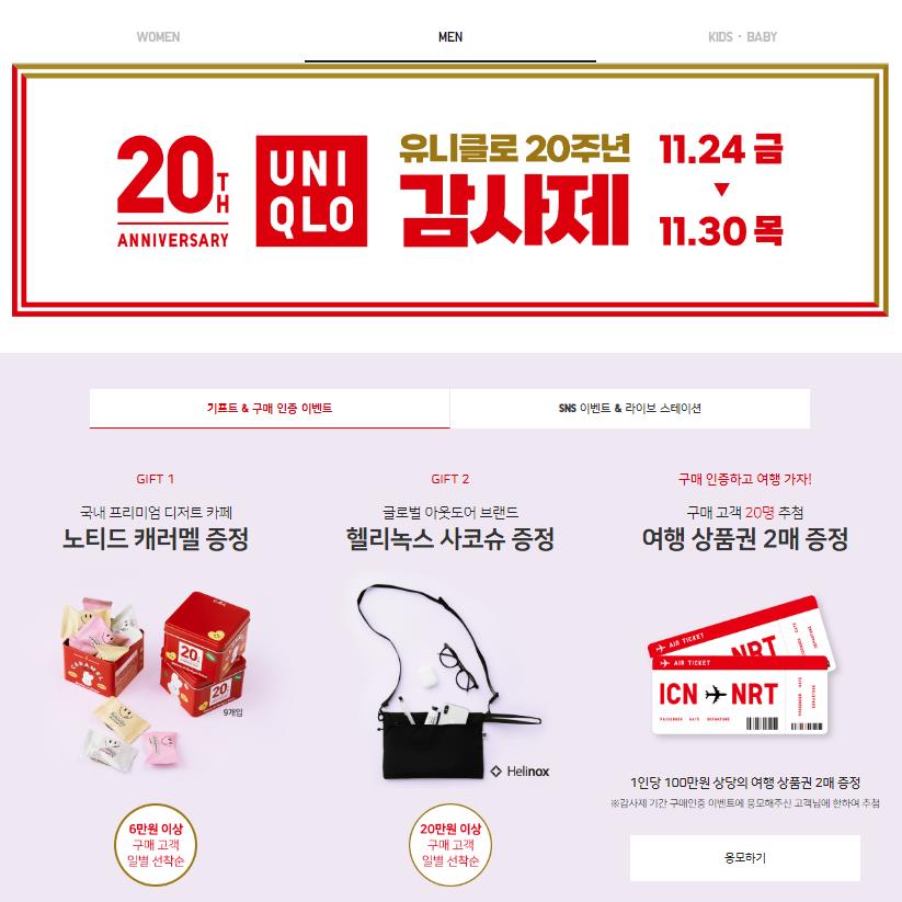 이번 유니클로 감사제는 20주년 기념으로 진행되며 11월 24일(금)부터 30일(목)까지 진행됩니다.