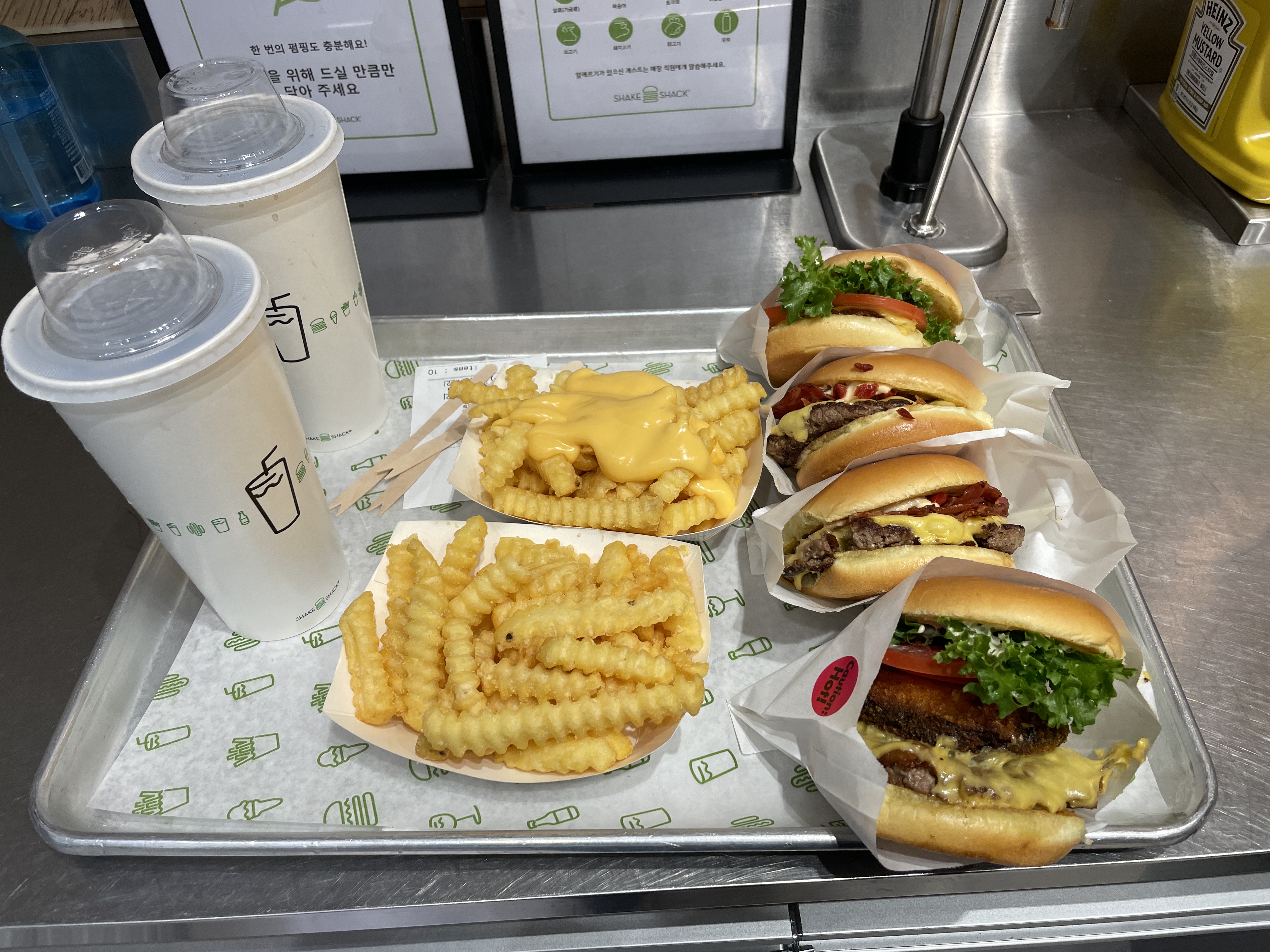 쉑스택, 스모크쉑, 쉑버거, 프라이, 치즈프라이 그리고 음료는 두 잔만 주문했다.