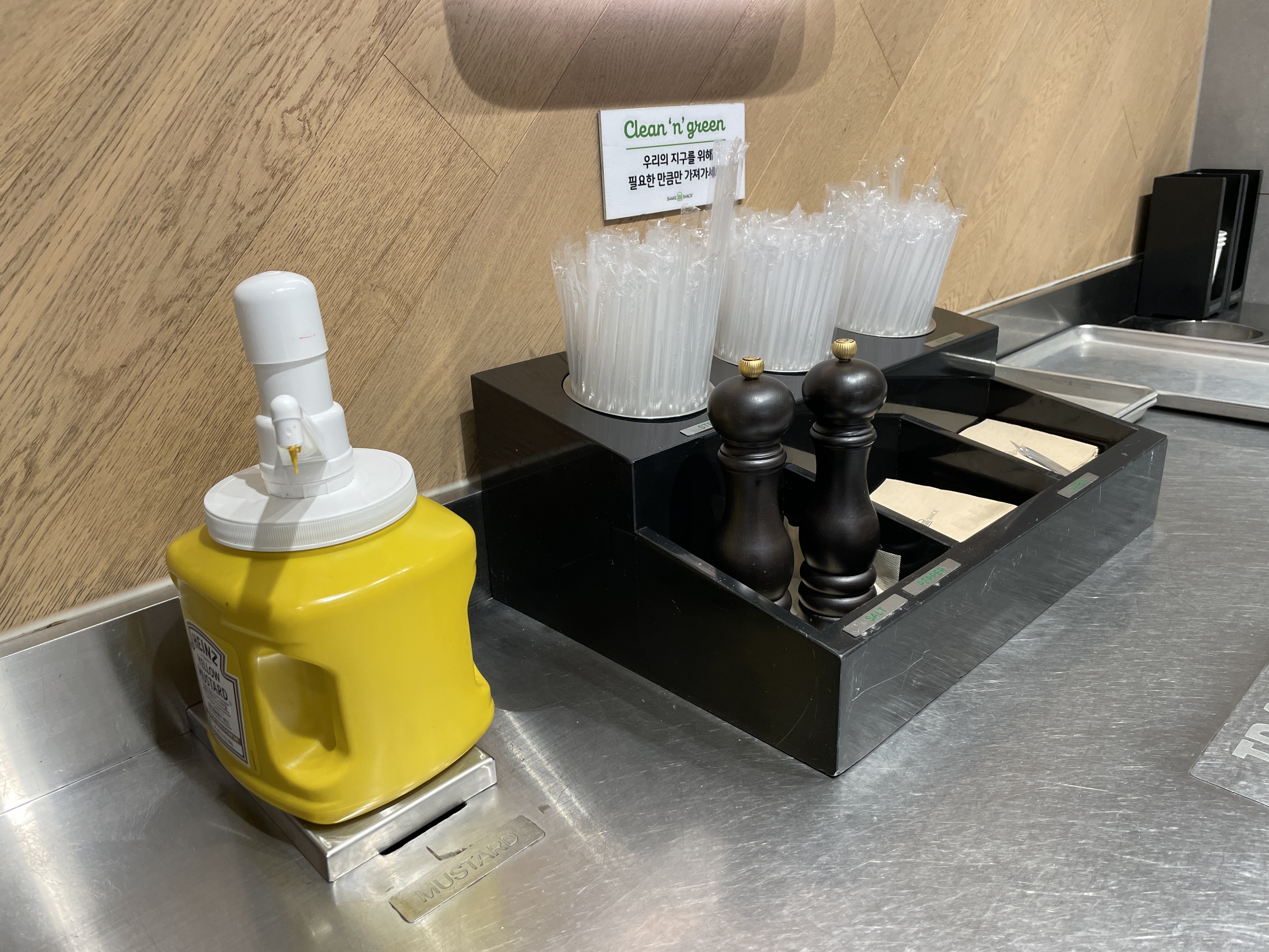 프라이 등을 위한 토마토 케찹과 머스타드를 양껏 이용할 수 있었다.