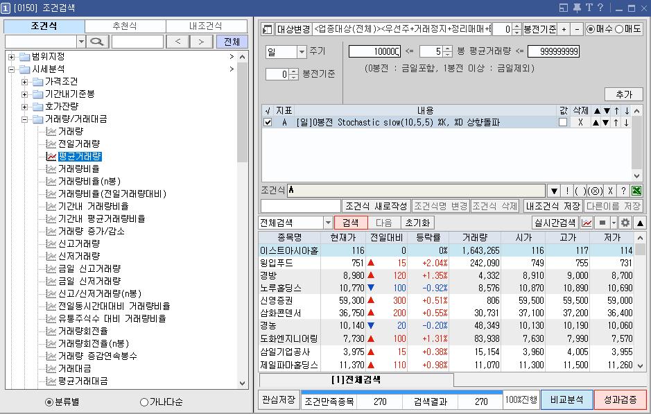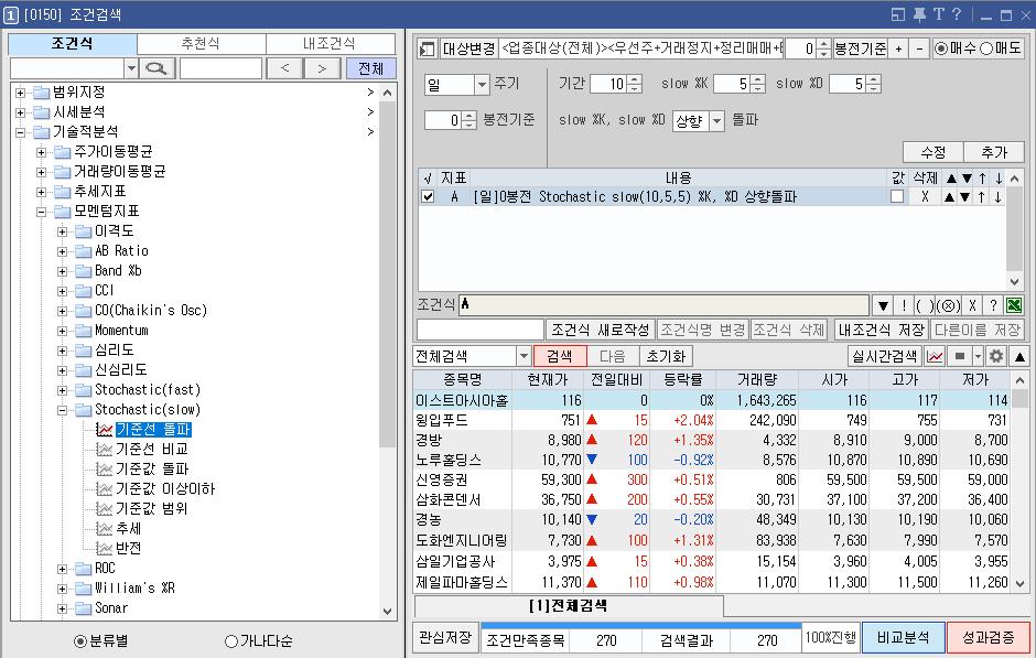 0봉(당일자 캔들)에서 스토캐스틱 슬로우 10/5/5에서 상향 돌파가 나온 종목은 무려 270 종목이다.
