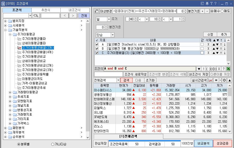 240일 이동평균선과 10일선이 정배열인 상황이며 현재 주가가 10일선 위에 있는 종목으로 걸러내니 50종목이 나왔다.
