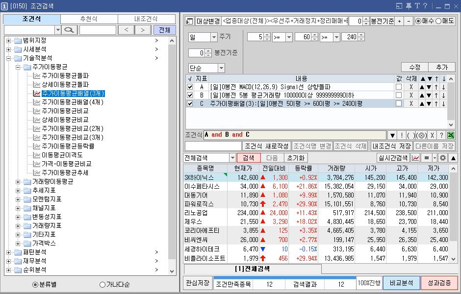 MACD와 이평선이 조건검색식에 잘 맞게 나왔다.