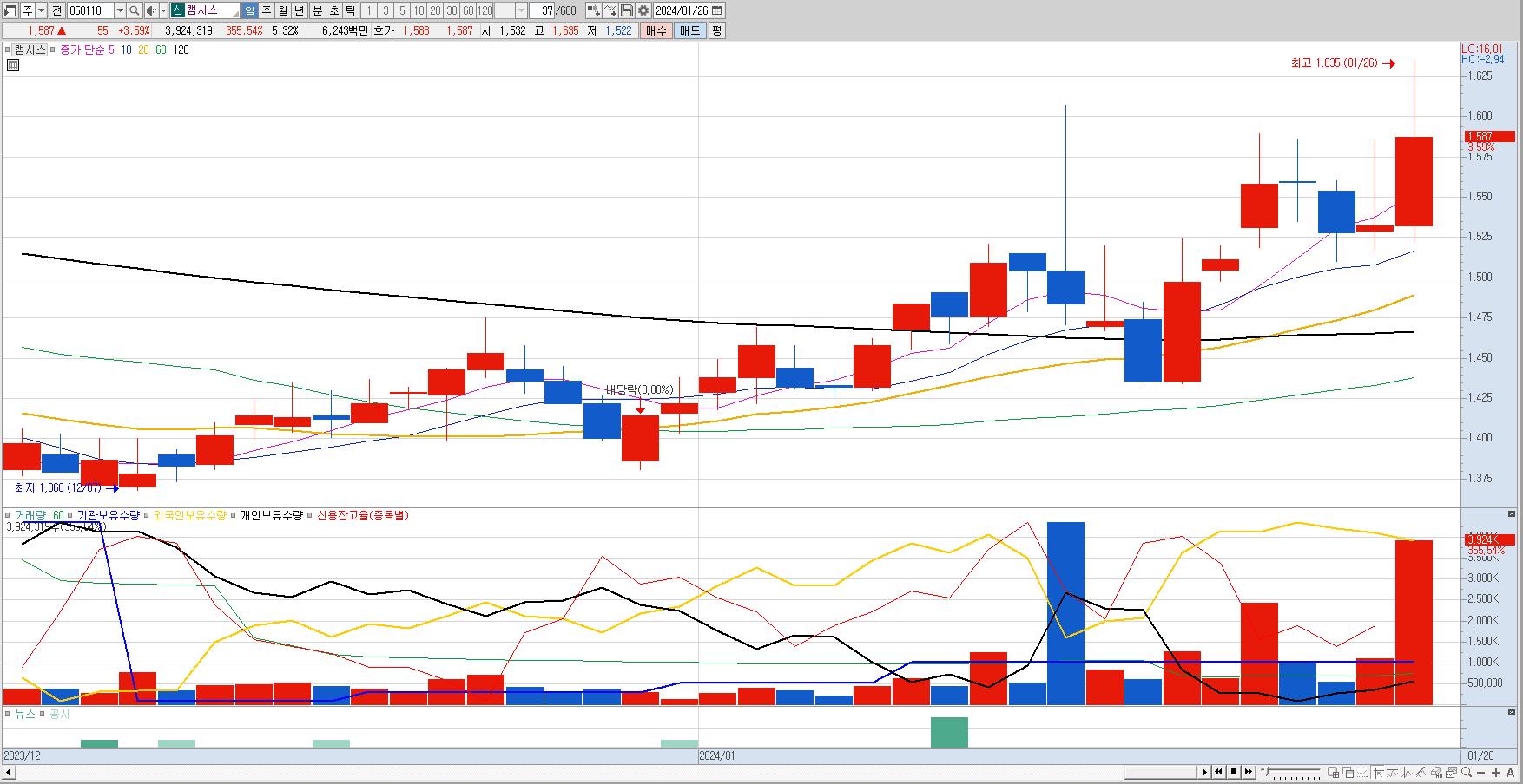 캠시스. 저항대 매물을 잘 소화하고 있는 모습으로 본다.