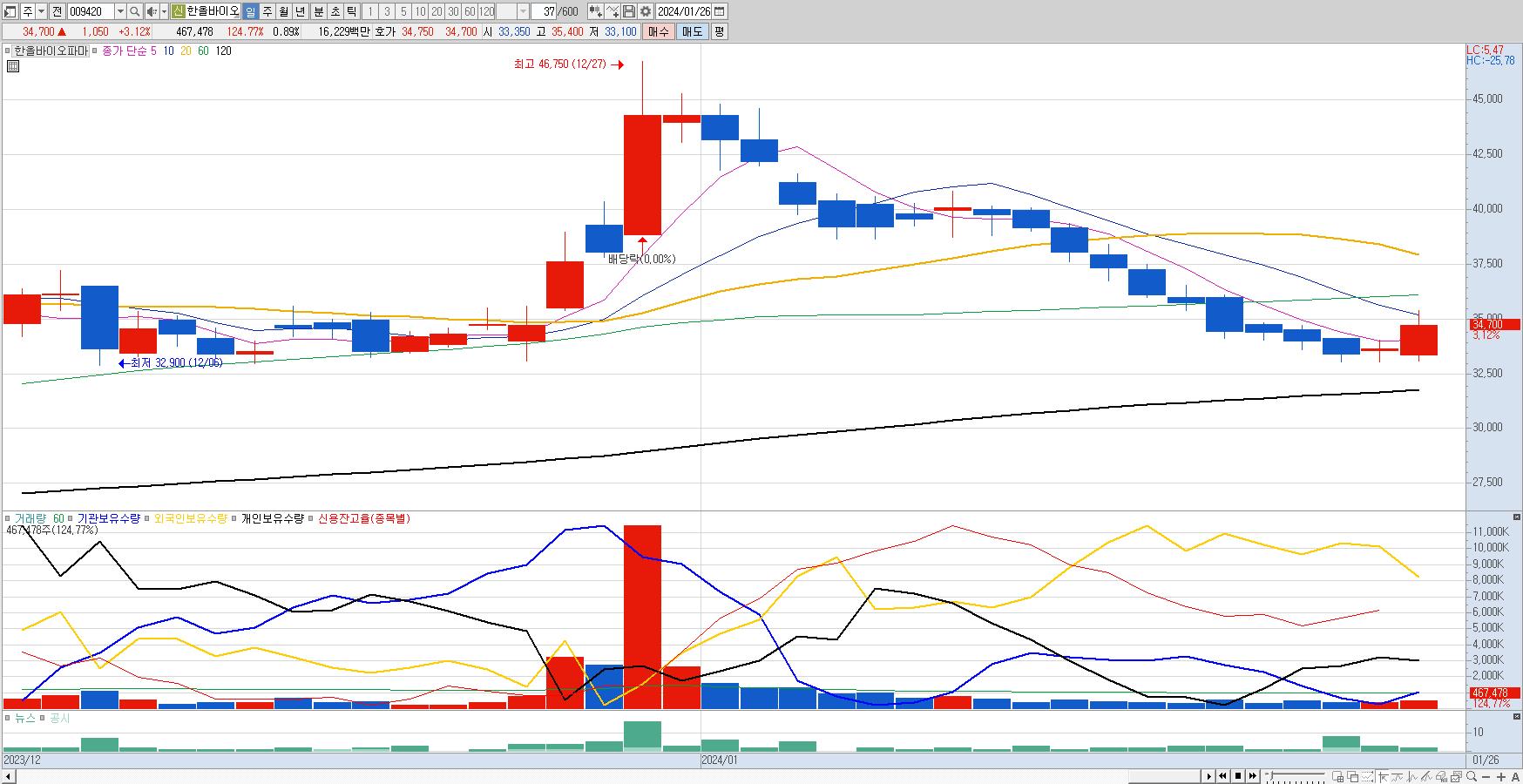한올바이오파마의 일봉차트. 5일선 돌파가 오랜만에 나왔다. 이제는 10일선 돌파가 필요해 보인다.