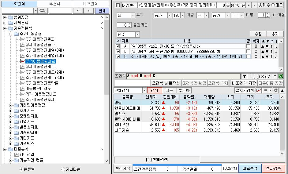 일봉상 쓰리 인사이드 업 패턴에 평균 거래량 조건과 120일 이동평균선 위에 위치한 종목들을 찾는 조건이다.