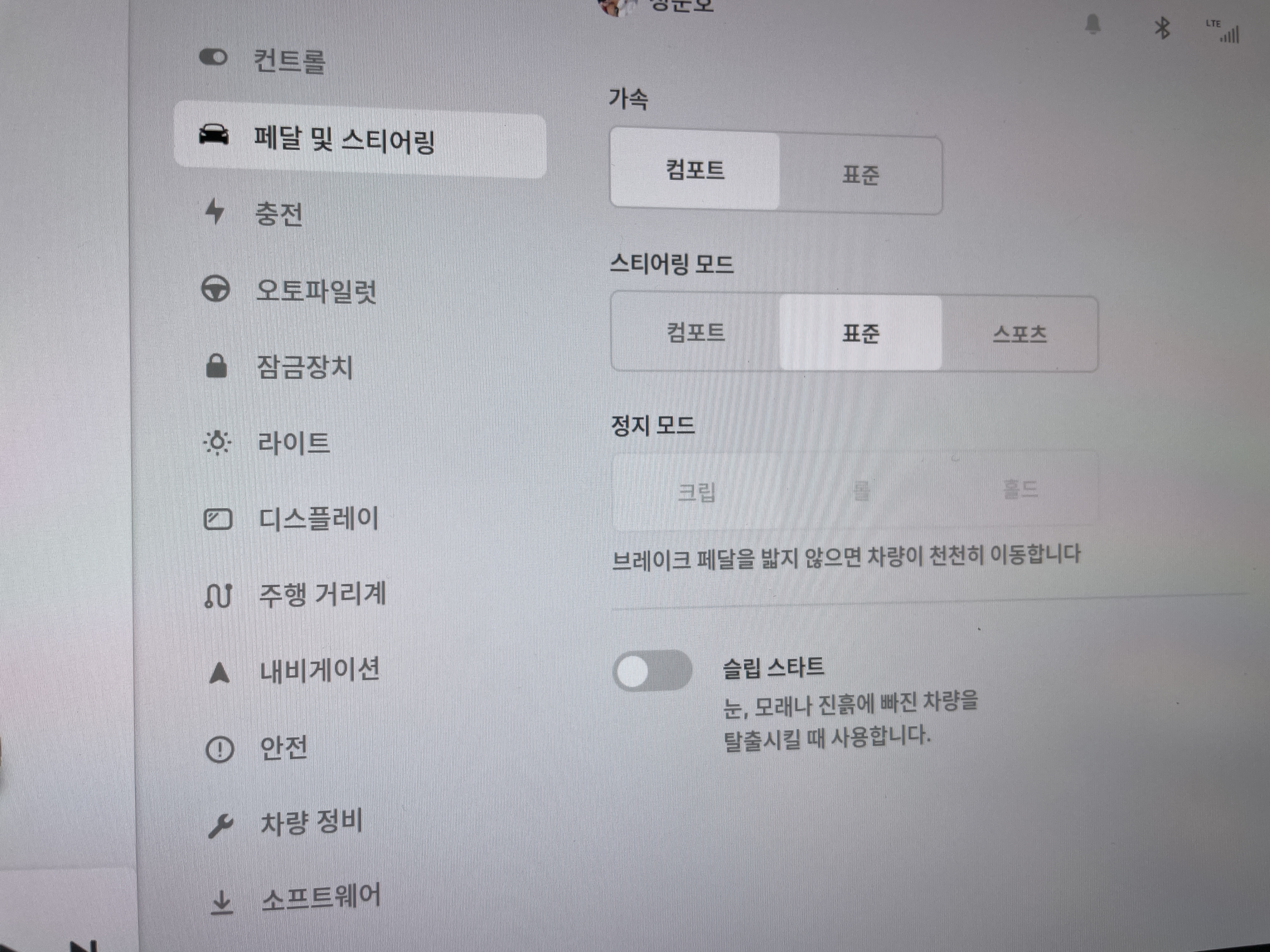 경사로 밀림 방지 기능이 있는 차를 타시다가 테슬라 차량을 타시는 경우, 그리고 홀드 모드가 아닌 크립 모드로 주행 중인 분이시라면 홀드 기능을 활용해 보시기 바랍니다.