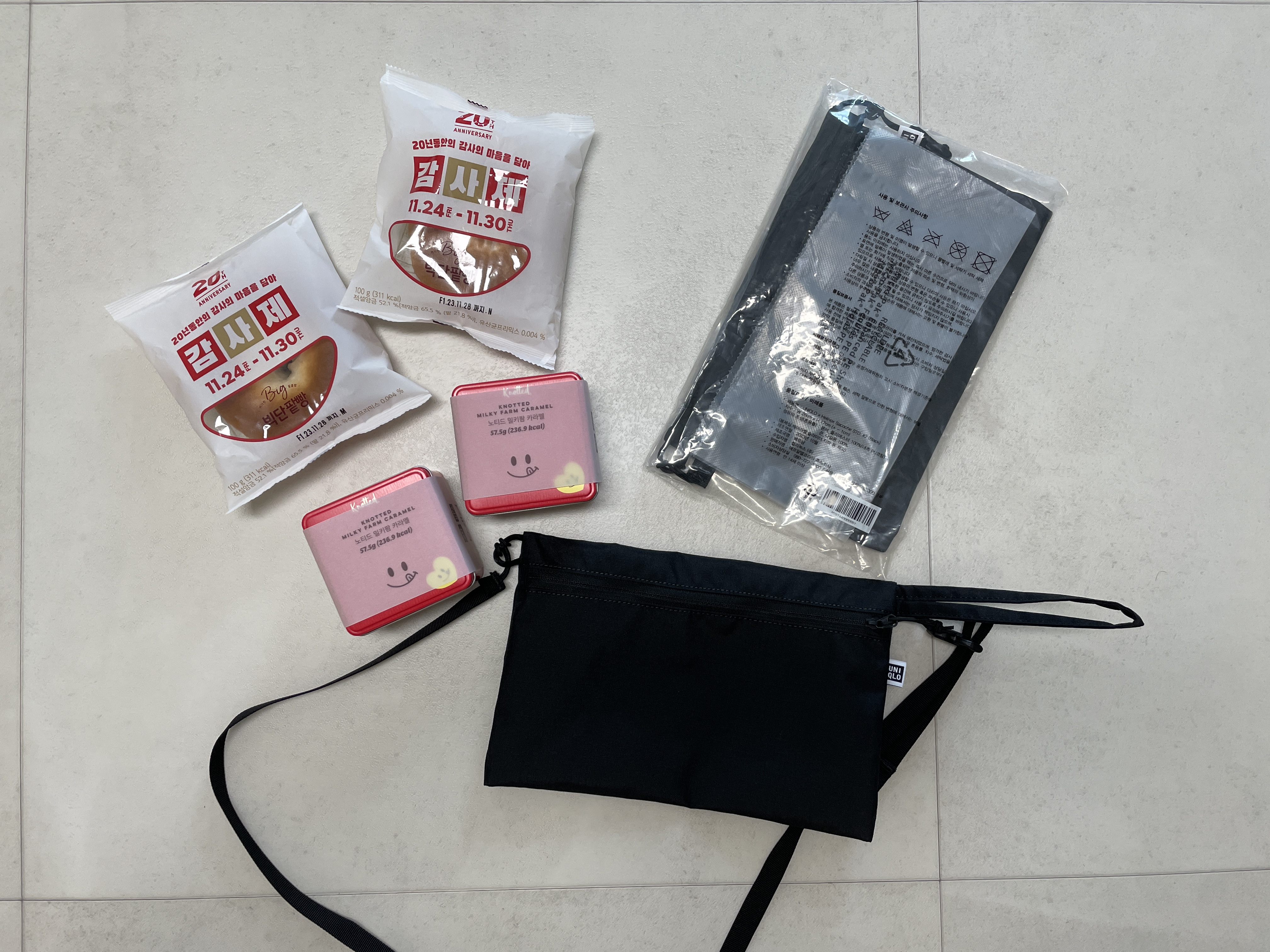 스타필드 하남 유니클로 감사제 사은품 획득 이번 유니클로 감사제는 기다리는 사람들이 특히 더 많았던 것 같습니다. 11월에 접어들자 유튜브, 블로그 등 많은 매체를 통해 감사제에 대한 기대감을 확인할 수 있었으며 여러 콜라보 제품들의 인기 덕분에 이번 유니클로 감사제의 흥행을 예상하고 있었습니다. 이번 유니클로 감사제에서 특히 눈에 띄는 것이 바로 이 사은품들입니다. 6만원 이상 구매시 일별 선착순으로 노티드 캐러멜 증정, 20만원 이상 구매시 일별 선착순 헬리녹스 사코슈를 증정하며 구매고객 20명 추첨 일본 여행 상품권 2매를 증정합니다. 스타필드 하남 유니클로 오픈런으로 둘이 20만원, 20만원 결제해 사은품을 받아 왔습니다. 단팥빵도 증정하더군요. 유니클로 패디드볼륨재킷은 보온성은 아직 모르겠으나 ..